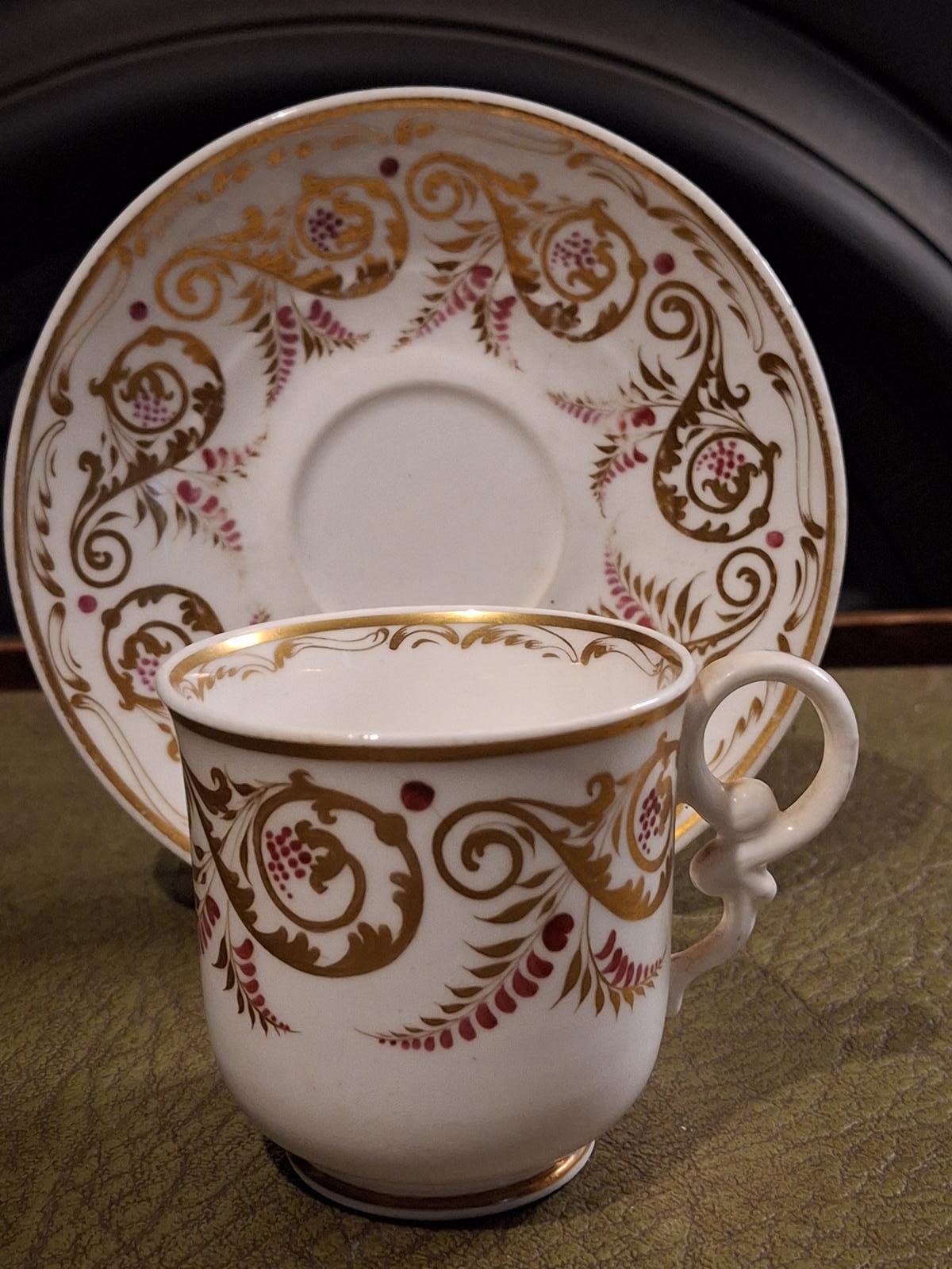 A beautiful 19th century Copeland and Garrett cup and saucer dating from 1833 - 1847 decorated with gilt and puce floral decoration the cup is perfect and has an ornate handle the saucer is perfect no chips cracks or hairlines just minor gilt rubbing the cup stands 7 cms high the saucer 15 cms in diameter