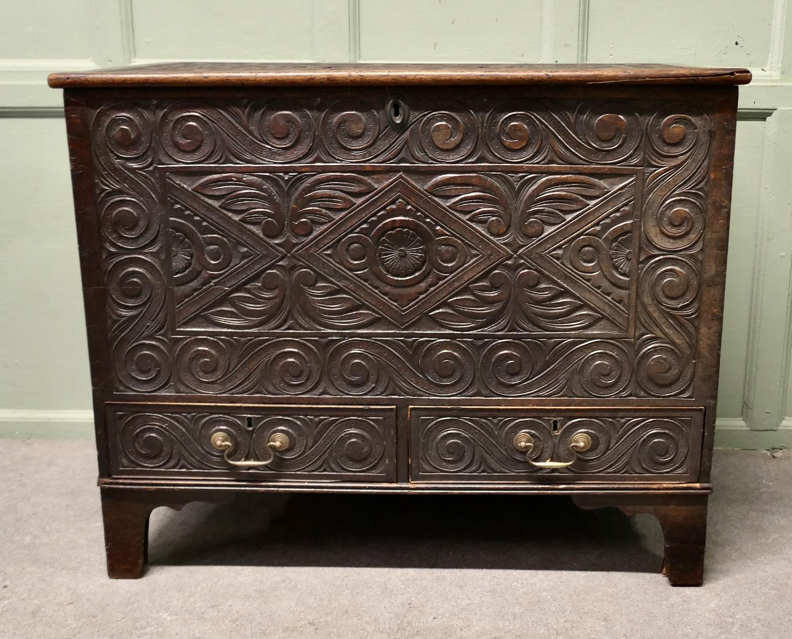 This is a beautifully carved Mule Chest with the benefit of 2 drawers rather than the more common single long drawer, the coffer has detailed carved panels mostly based on the tree of life patterns however on the top we have a very playful Green man