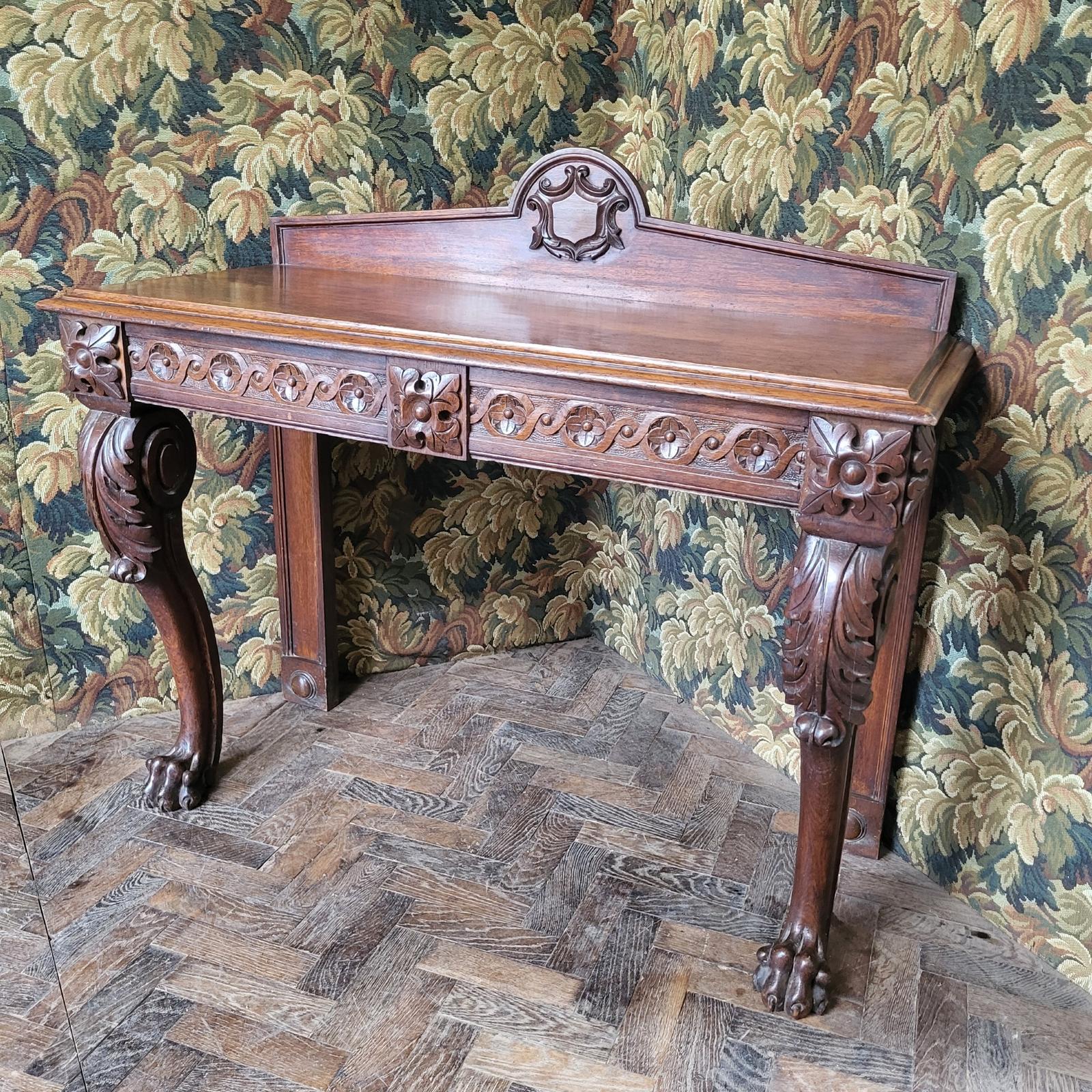 This Victorian oak console table from Hutton-Clarke Antiques showcases the intricate craftsmanship typical of the era. The table features deeply carved scrollwork along the frieze, with beautifully rendered floral and foliate motifs. The cabriole legs are embellished with bold, lion-paw feet, adding a sense of grandeur and stability. The top is supported by a raised back, adorned with a shield-shaped design at the centre, enhancing its decorative appeal. This piece is made from solid oak and combines elegance with durability, making it an exceptional addition to any traditional or classic interior.