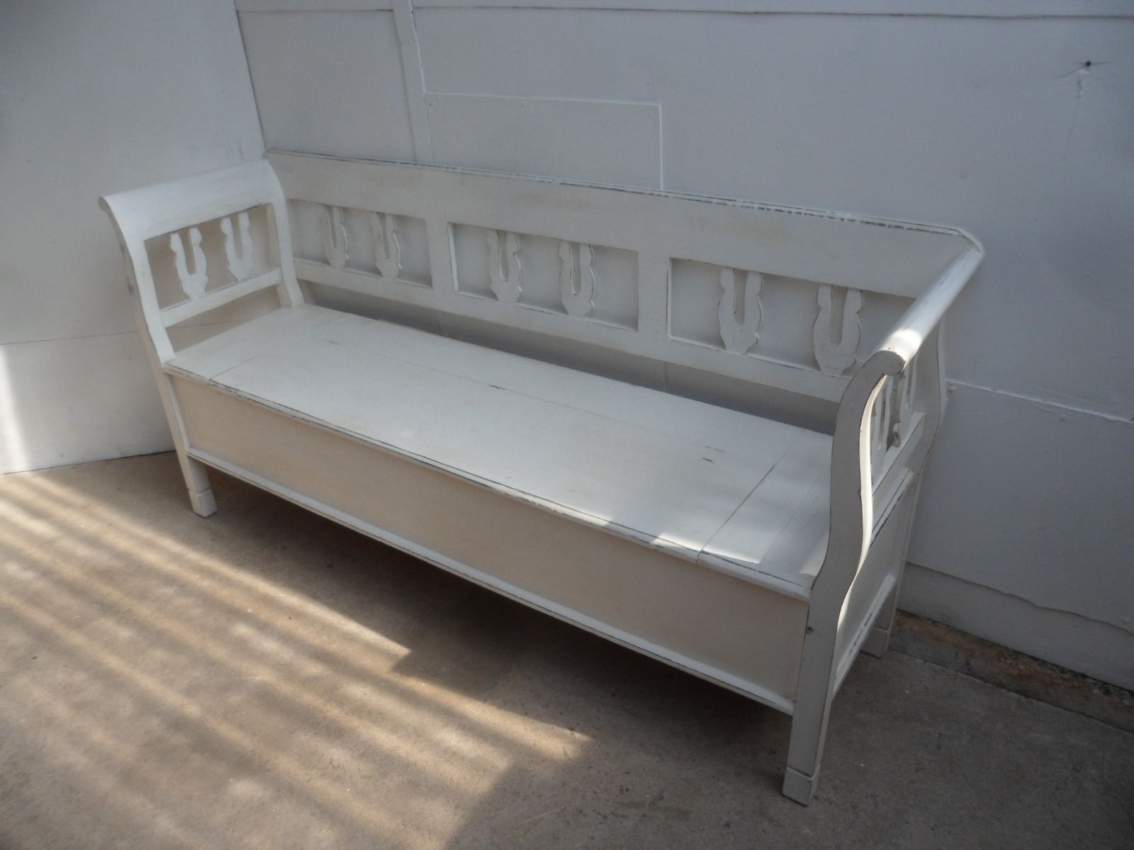 Cracking Pine Painted White 3 Seater Scrolled Shabby Chic Bench c.1920