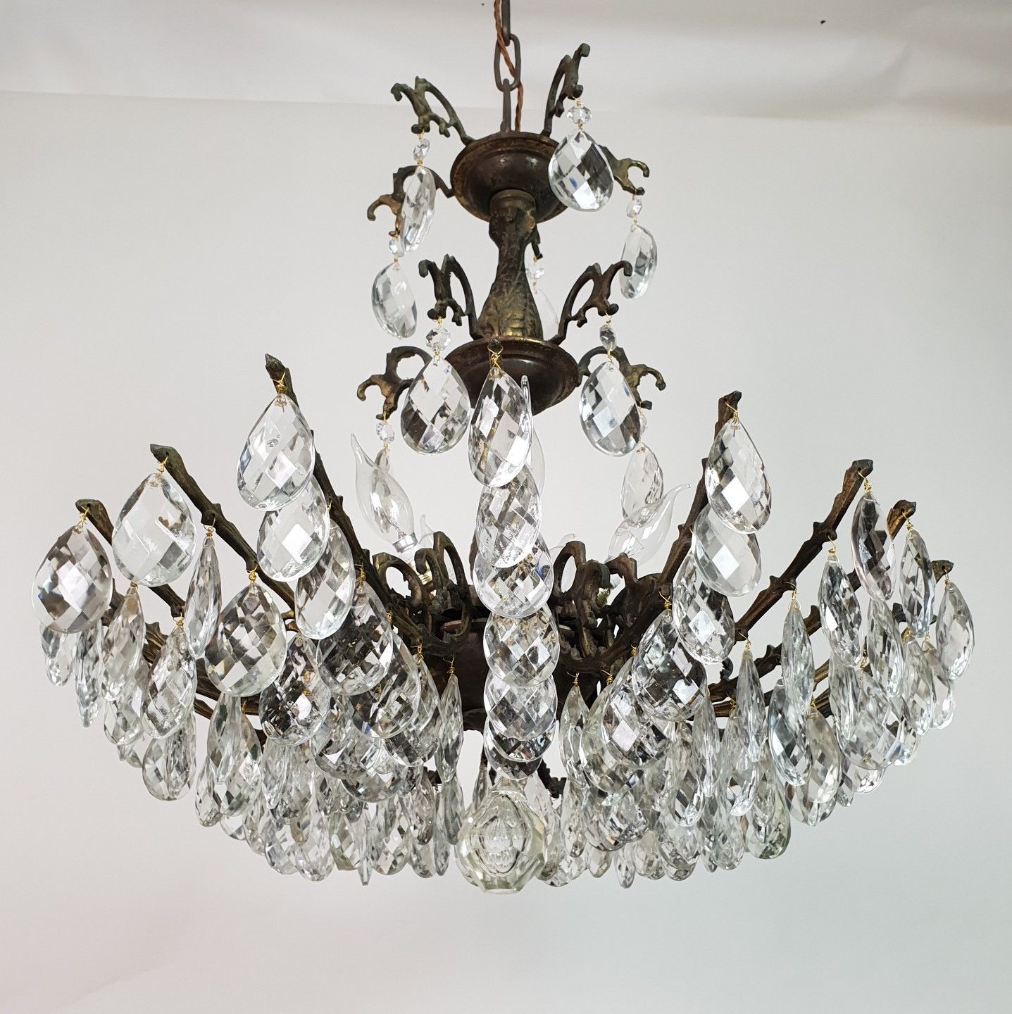 Crystal & Aged Brass Chandelier; Rewired C.1900