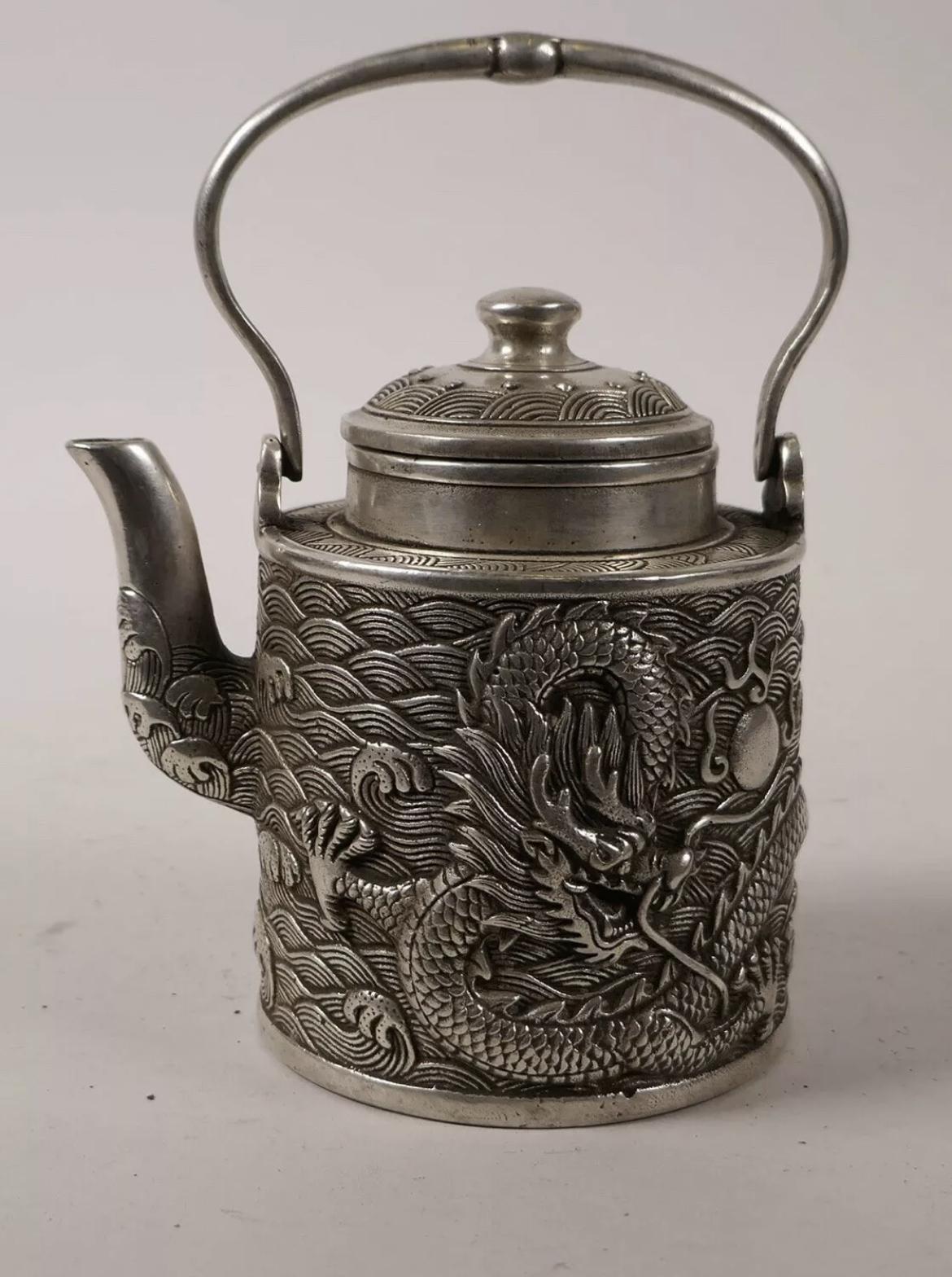 Cylindrical Chinese Silvered Metal Teapot & Cover - Qianlong Emperor 1736-1795