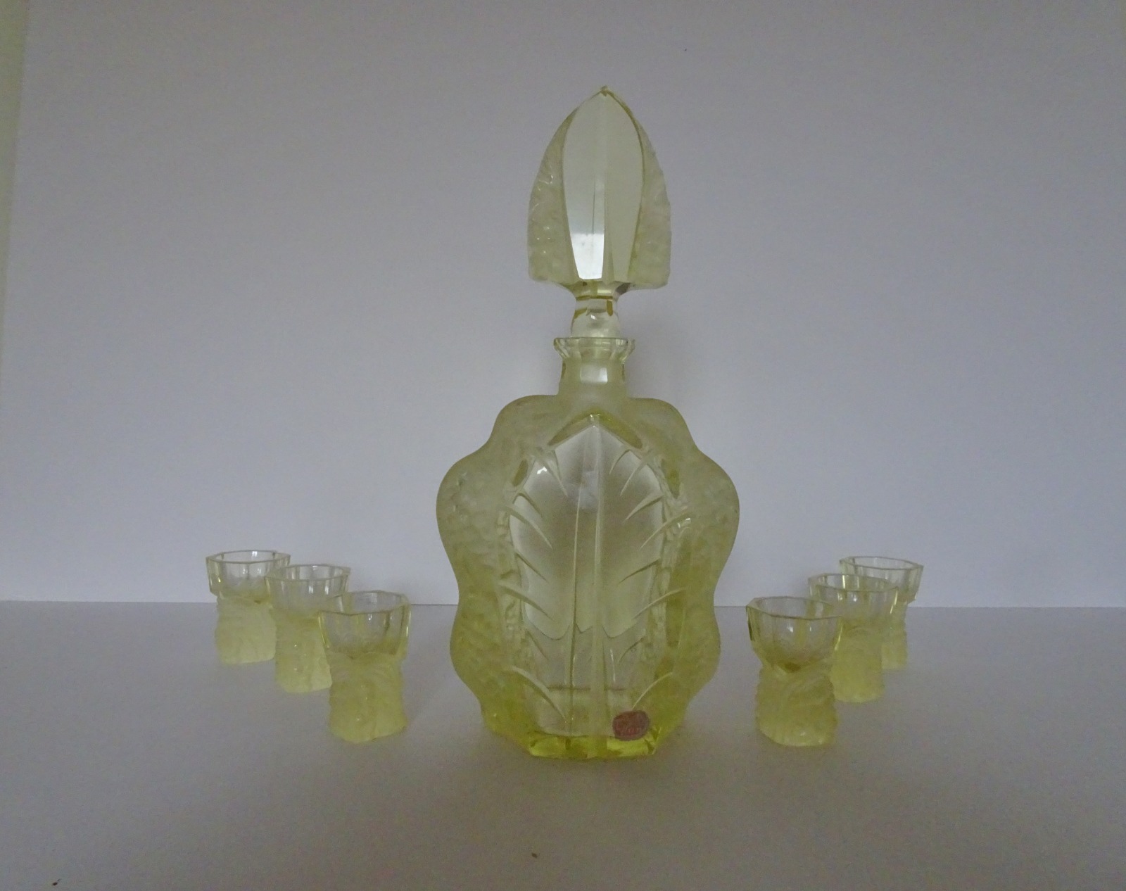Czechoslovakian Yellow Uranium Glass Decanter Set. Annagelb. ca 1940