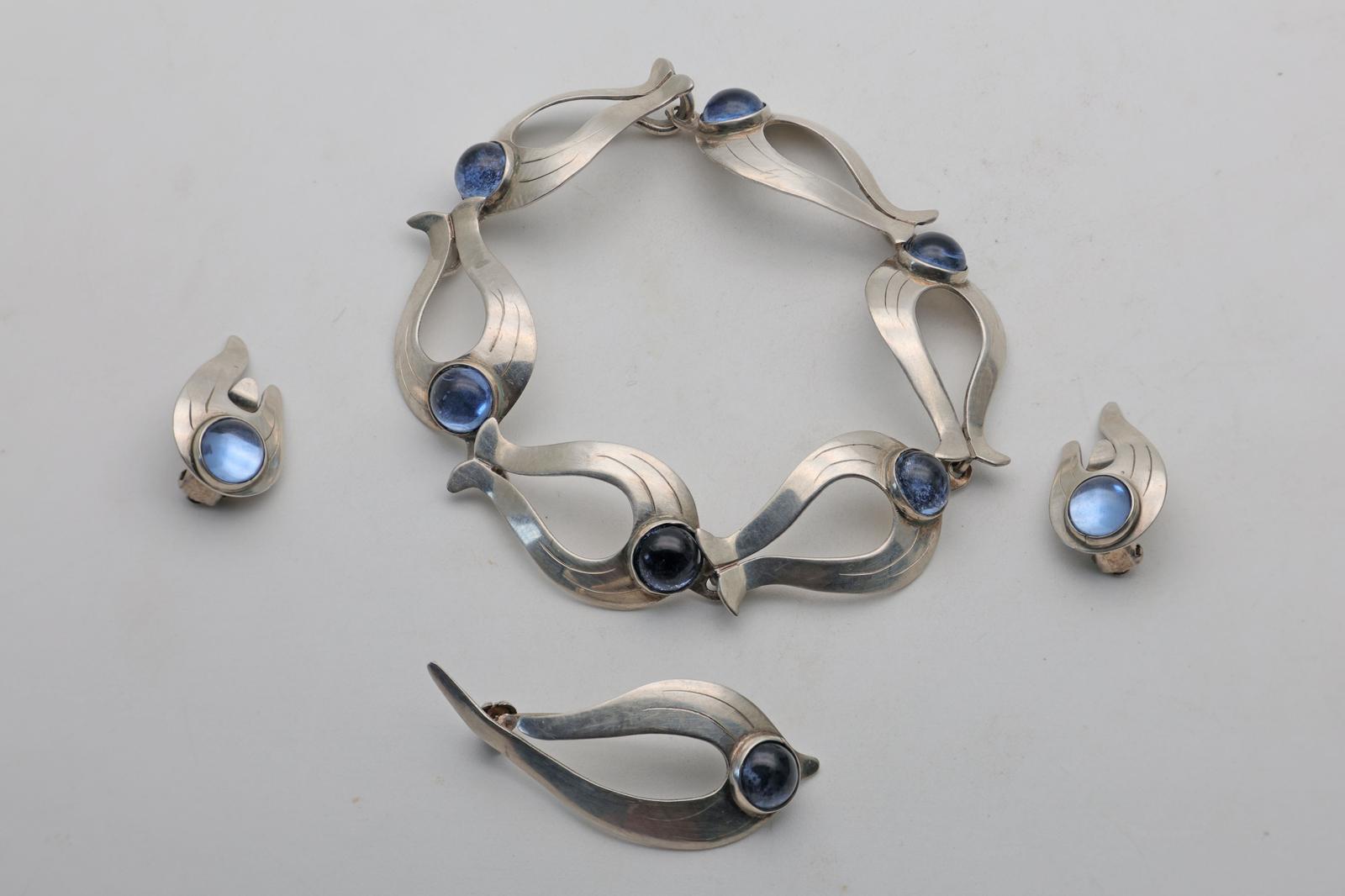 Set consisting of a silver bracelet, brooch and earrings. All in sterling silver with blue glass inserts. Very attractive. Stamped Ulrich, sterling handmade in Denmark. Bracelet 19cm. clip on earrings 2.4cm. brooch 5cm. total weight 25gm.