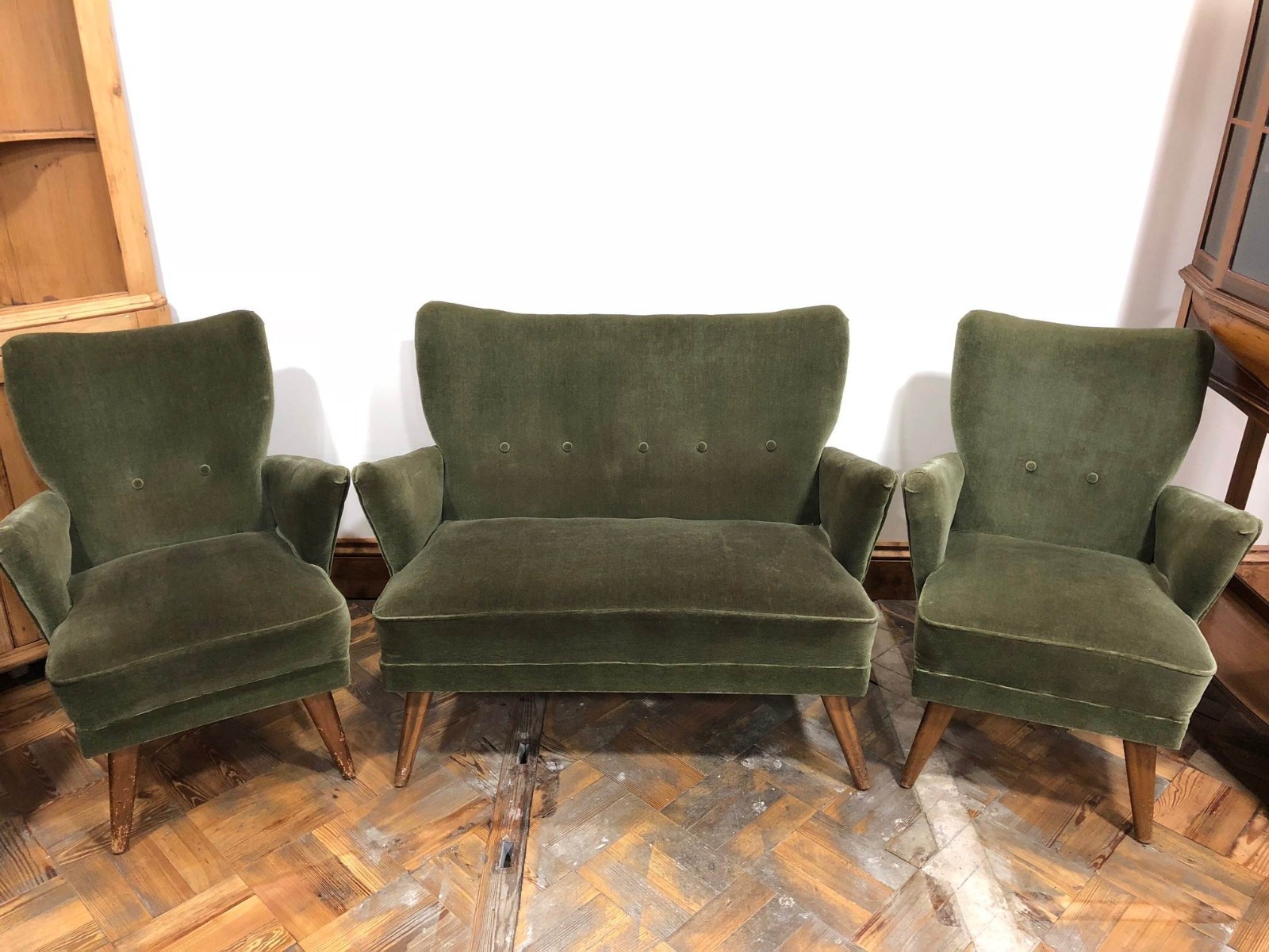Dark Green Mid Century Retro Sofa with Two Matching Armchairs (1 of 1)