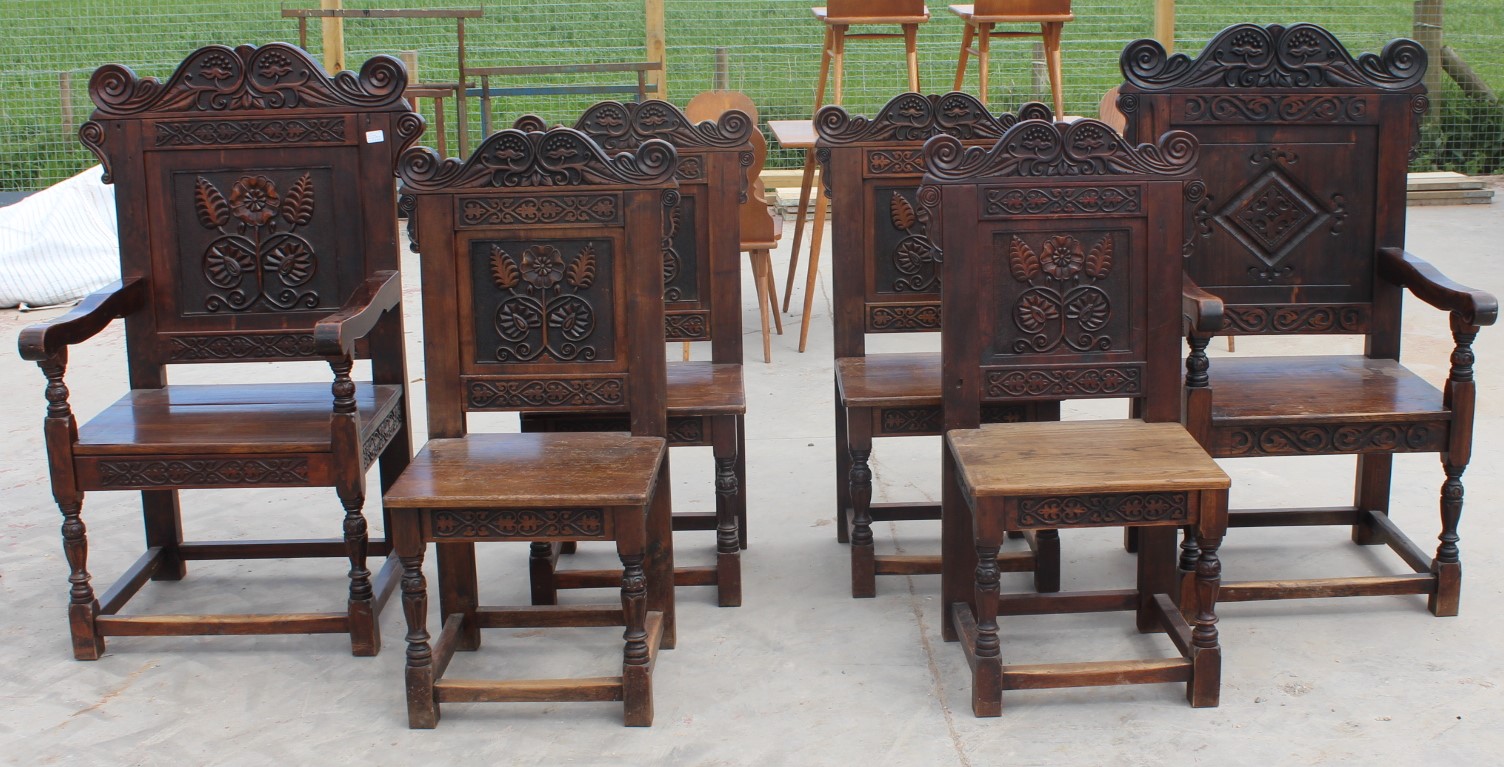 Dark Oak Over Carved Set 6 Dining Chairs 4 + 2 Carvers c.1880