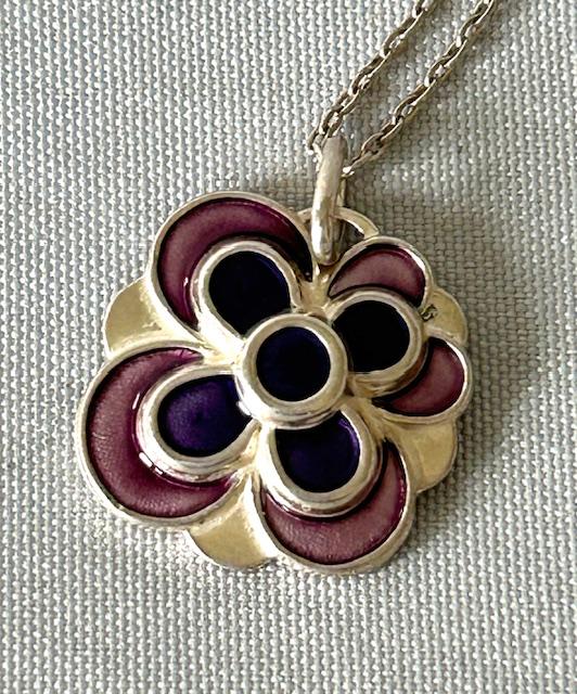 A fabulous Norwegian silver and enamel pendant necklace, by David Anderson. The pendant is designed to represent a stylized flower with enamels in mauve and lilac. To the reverse it is marked David Anderson, Norway, Sterling 925S. Supplied with a vintage silver cable chain marked Sterling, it is a beautiful and ready to wear piece, by a great Maker.