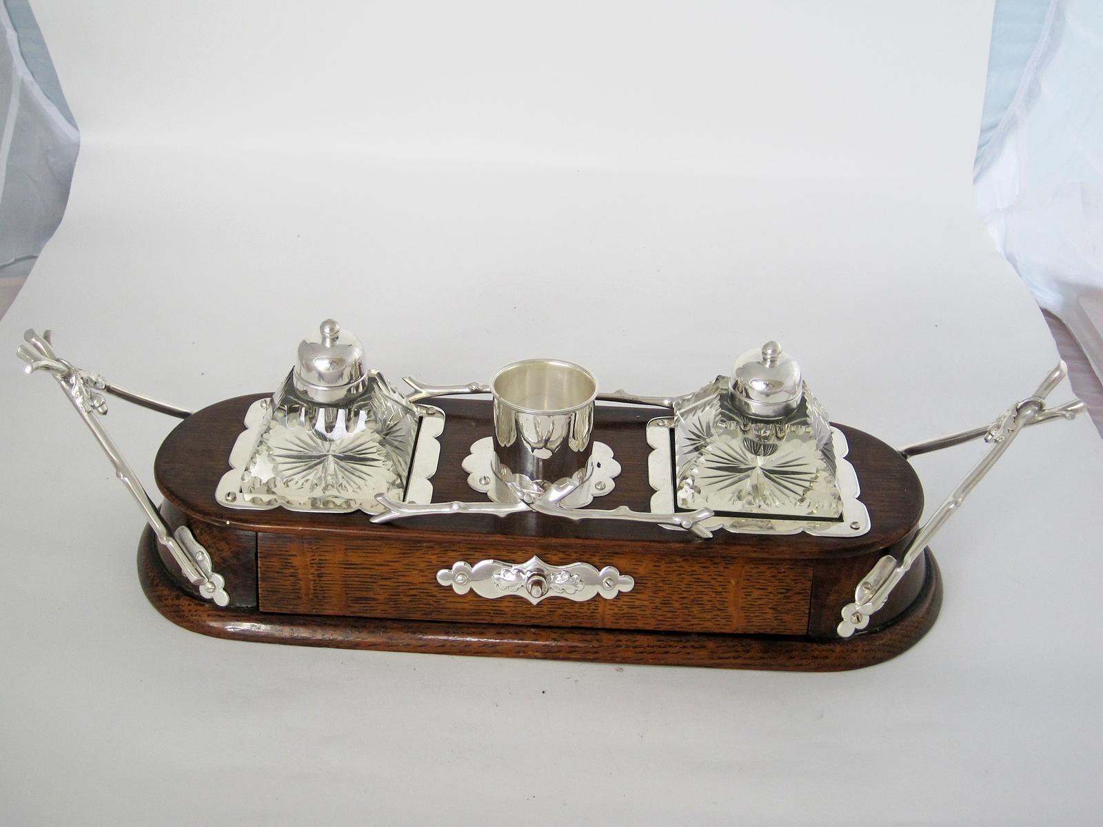Decorative Late Victorian Oak & Silver Plate Ink Stand