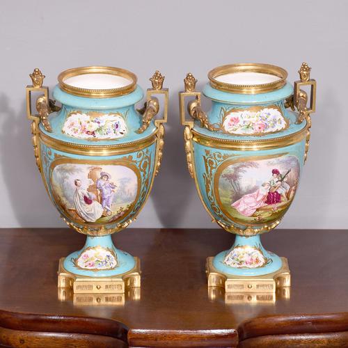 Circa 1870.Pair of Sevres-style pale blue ormolu-mounted porcelain vases. The vases with beaded ormolu (gilded brass) rims and ormolu-mounted neck with panels of hand-painted flowers on a duck egg blue background. The sides with neoclassical ormolu handles with bell flower chains. The vase body with decorative panels of musicians and floral arrangements, over neat ormolu supports and an ormolu base with cut out corners, with further panels of foliate decoration.