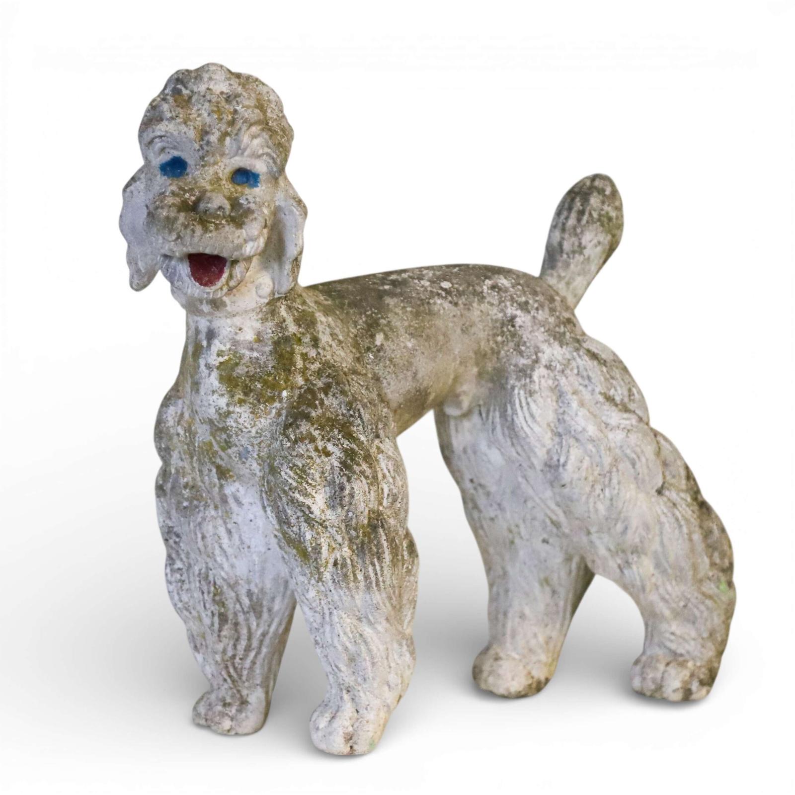 Charming mid-century painted stone poodle sculpture, c.1950, with original surface, playful character and strong decorative appeal for eclectic or modern interiors