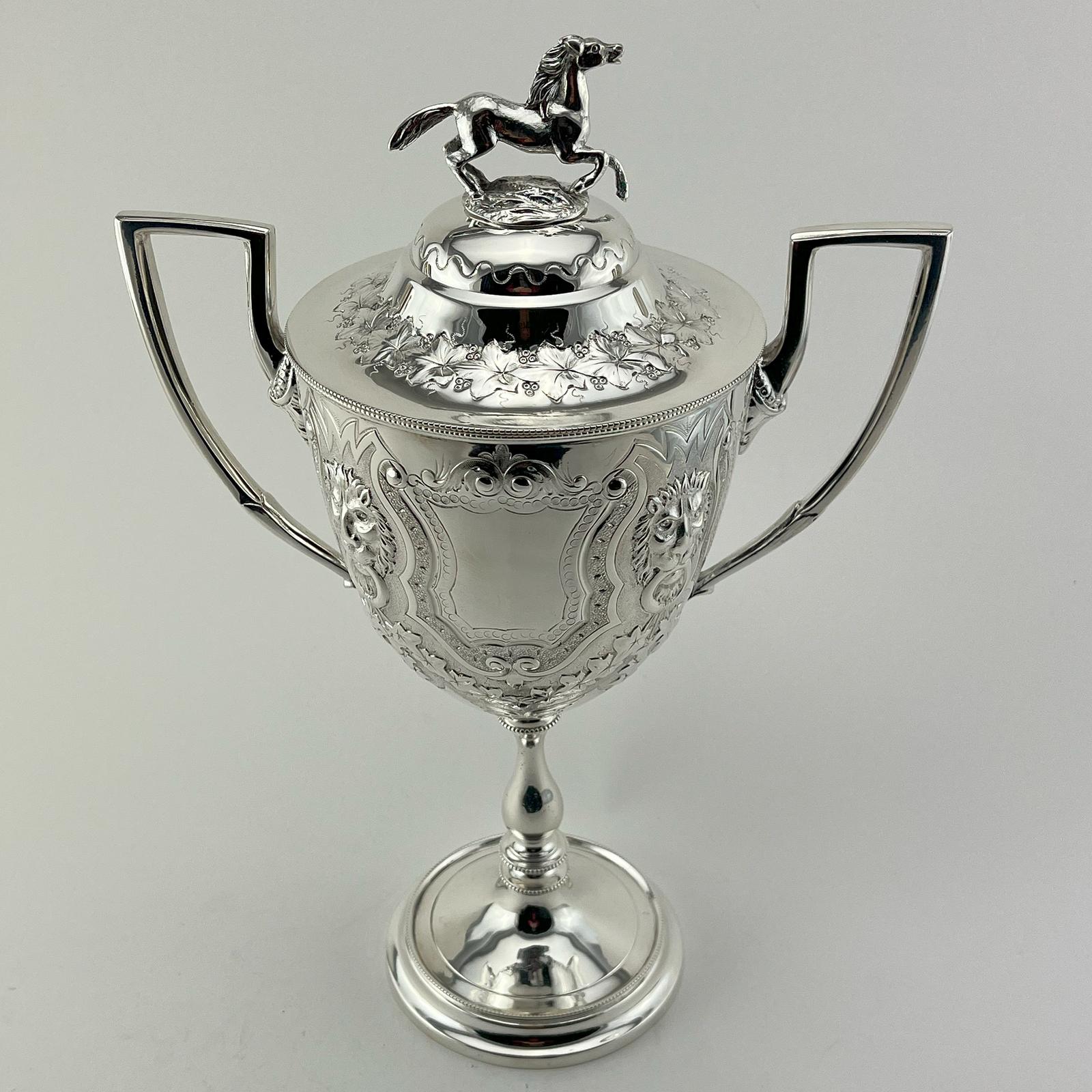 Decorative Victorian Lidded Silver Plated Trophy Cup with Horse Finial