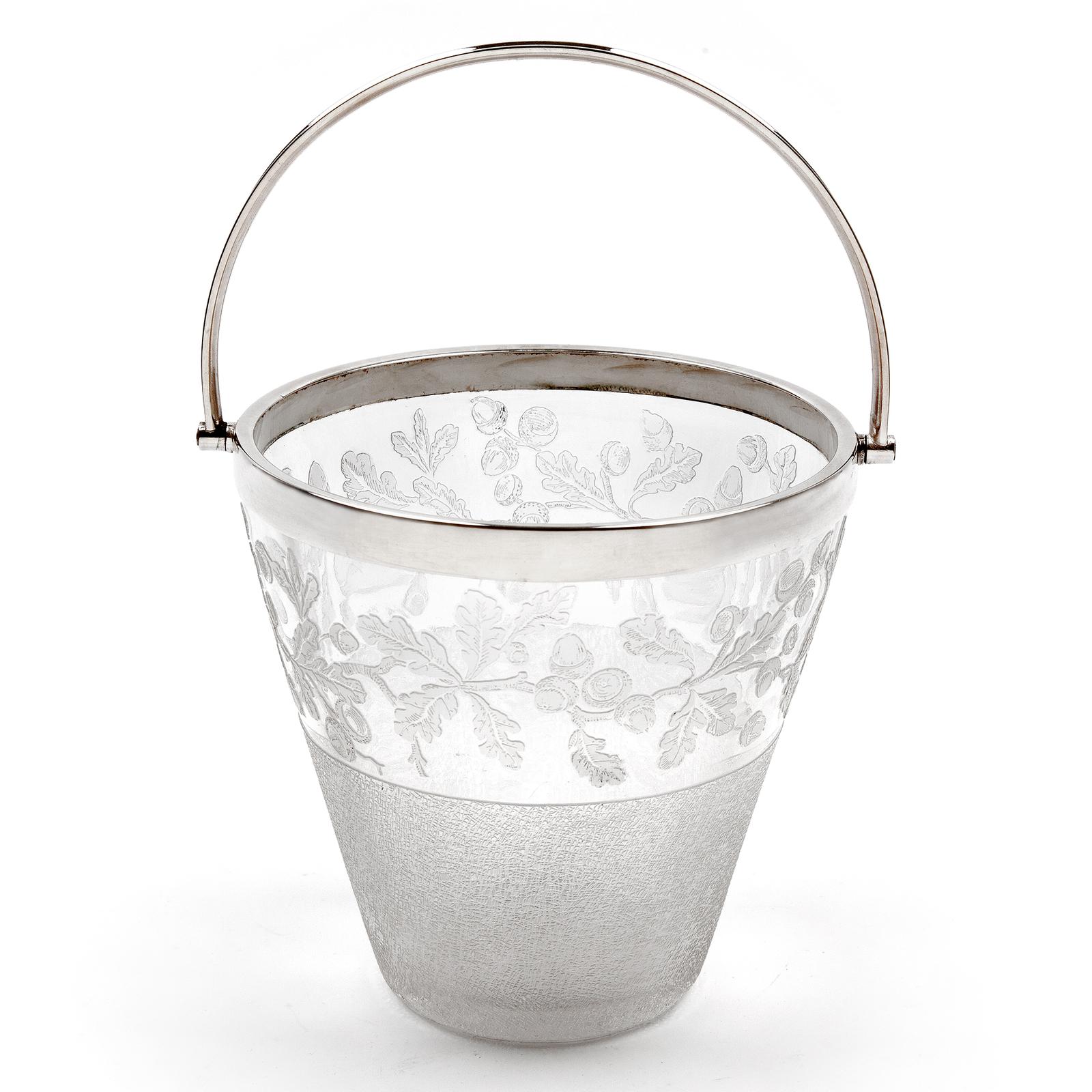 Decorative Victorian Silver Plated & Glass Ice Pail Etched with Oak Leaves