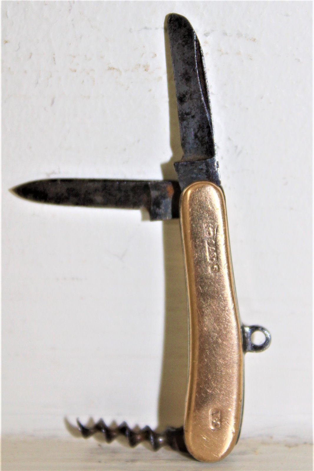 Delightful 9ct Gold Miniature Penknife with Two Blades and a Corkscrew with a Loop to Wear as a Pendant English c 1880 to 1900