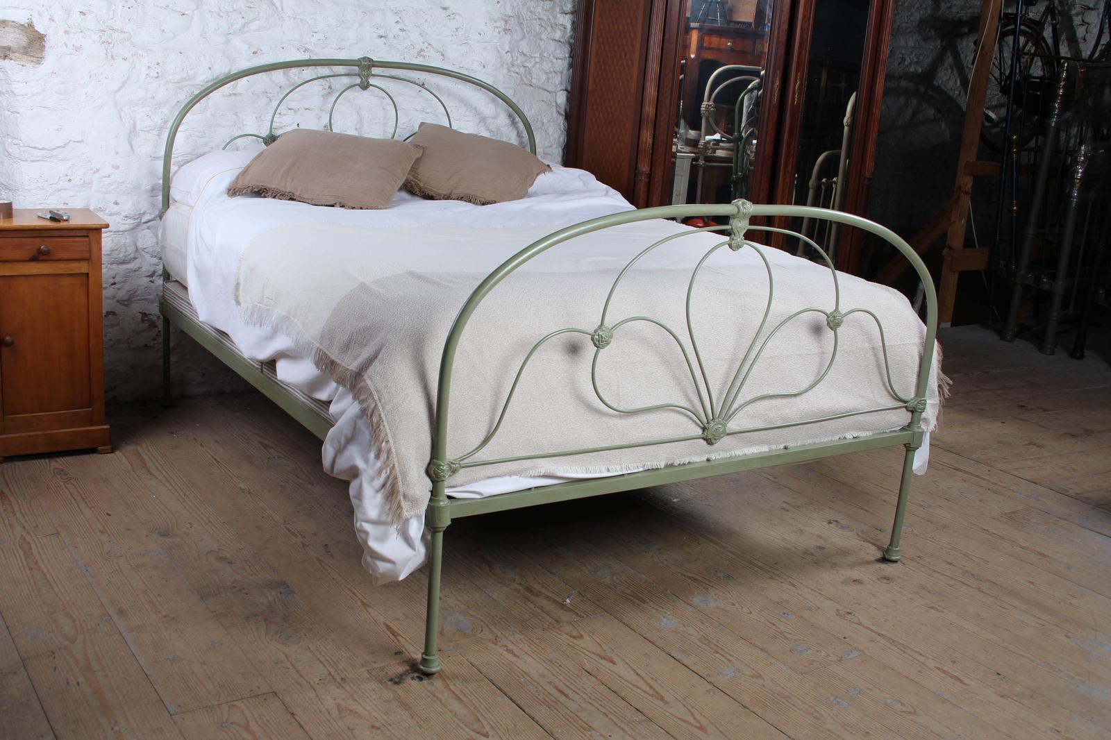 Fully restored to be sturdy, practical and beautiful. Whole frame cleaned and tested for durability. Shot blasted and primed prior to hand paint finish in Little Greene’s Sage Green, gently dark waxed over to protect, give a soft sheen and a very gentle tonal variation throughout the bed. All joints checked for secure fit.