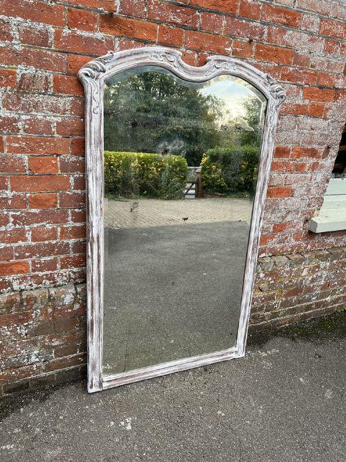 Delightful Large Antique French 19th Century Carved Wood Distressed Painted Shaped Top Mirror