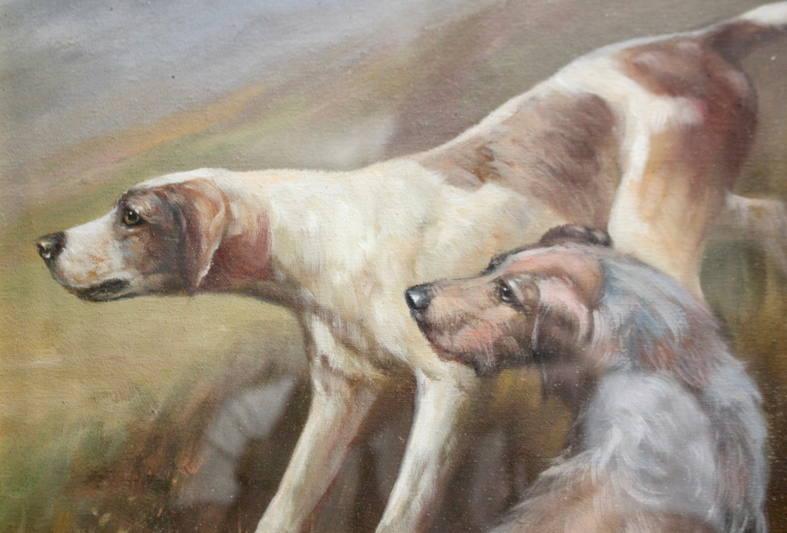 Delightful Late 19th Century Oil Painting On Board: Pointer Dogs On Moorland