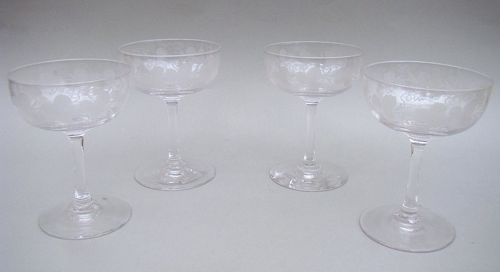 Delightful Set of 4 Victorian Etched Glass Champagne Glasses c.1880