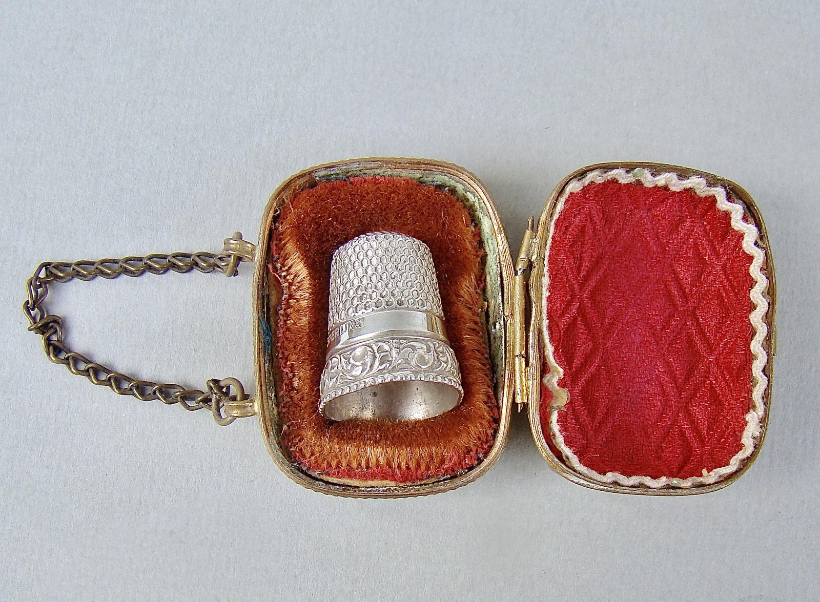 Delightful Sterling Silver Thimble In Ormulu Chatelaine Thimble Case, Circa 1890