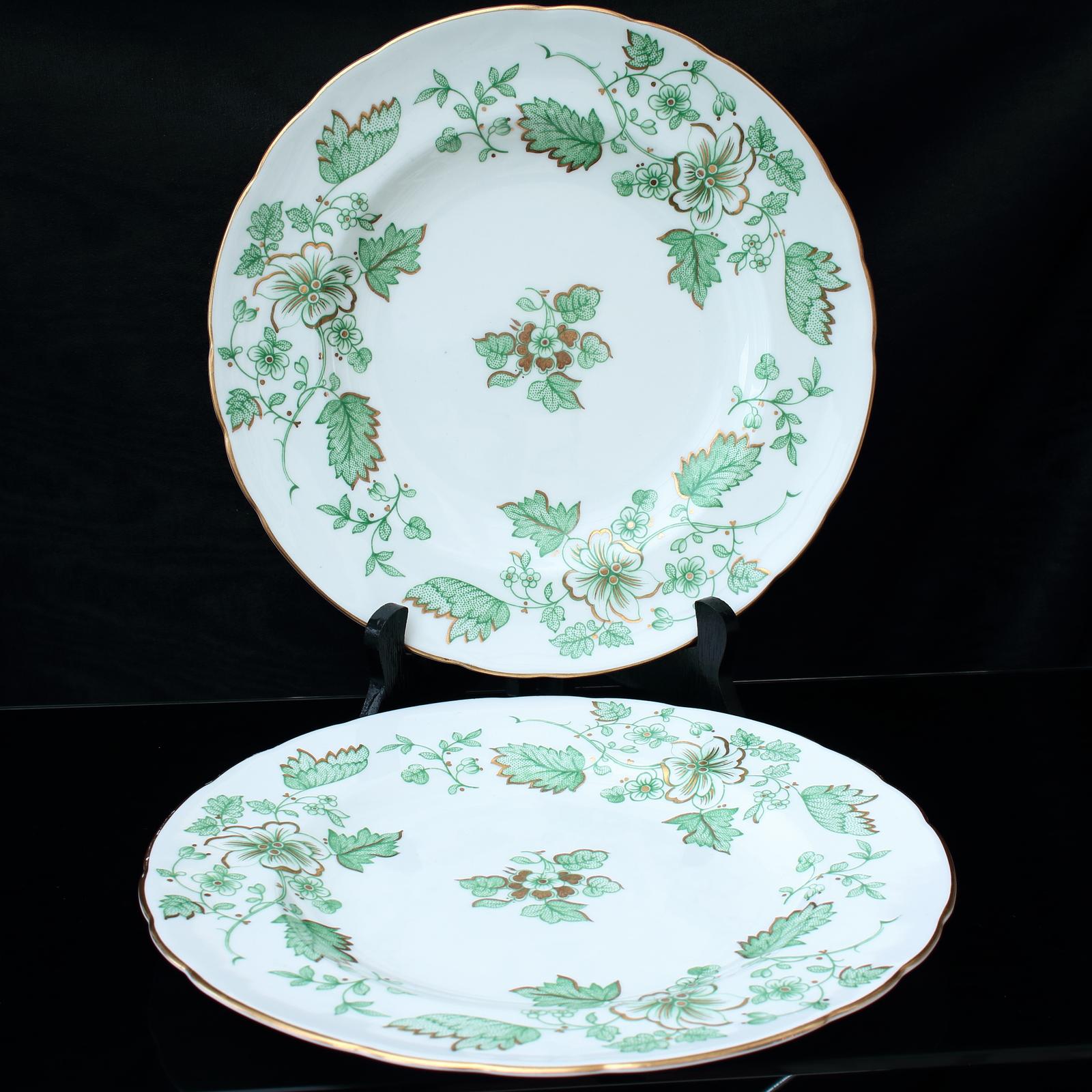 A wonderful pair of 1930s Royal Crown Derby porcelain plates decorated in gorgeous green leaves and flower with gilt accents, Royal Crown Derby mark underneath and date cipher for 1937/1938. A great addition to any collector's cabinet.