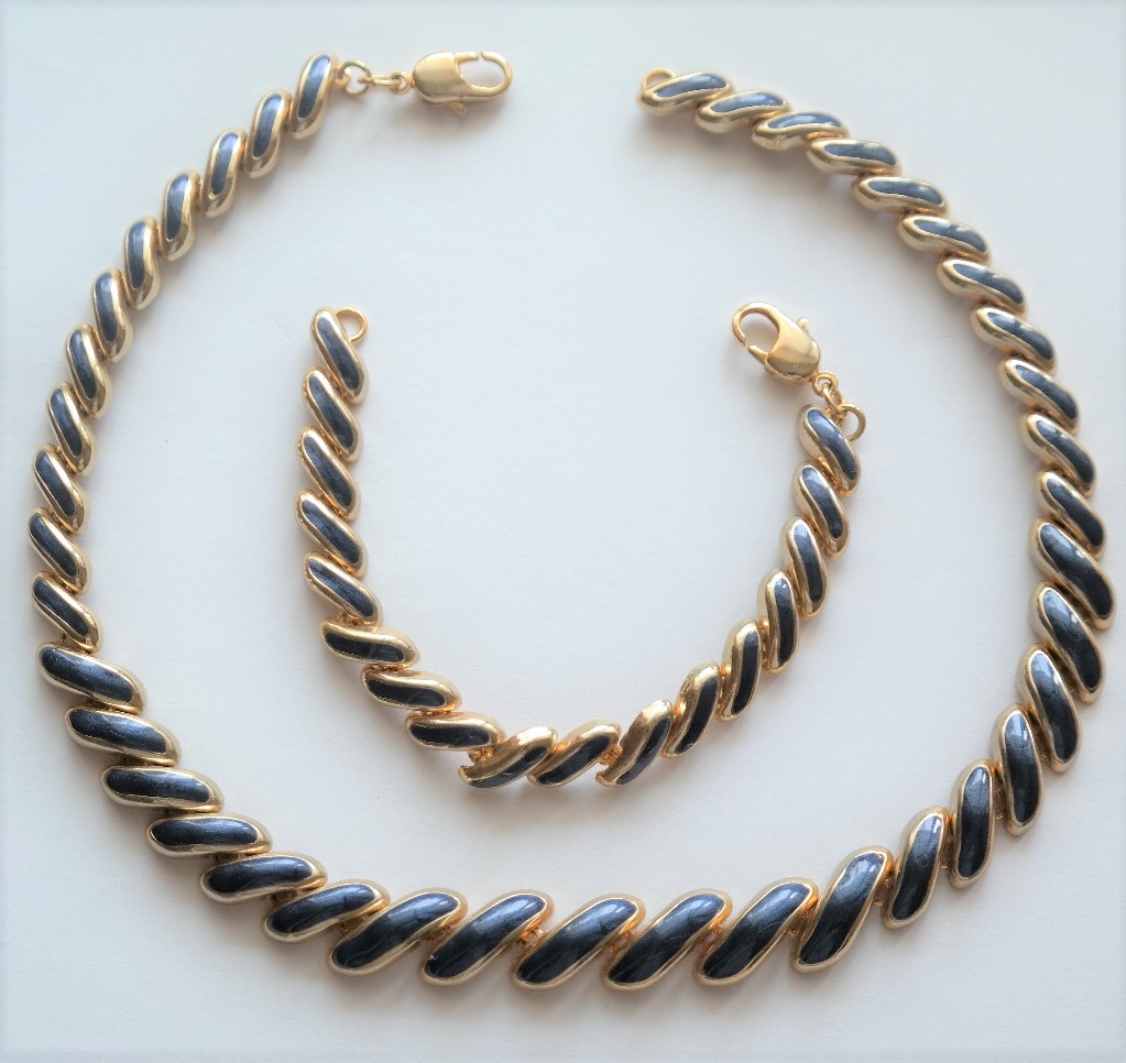 Designer Vintage Demi Parure Gilt Blue Enamel Necklace & Bracelet Boxed