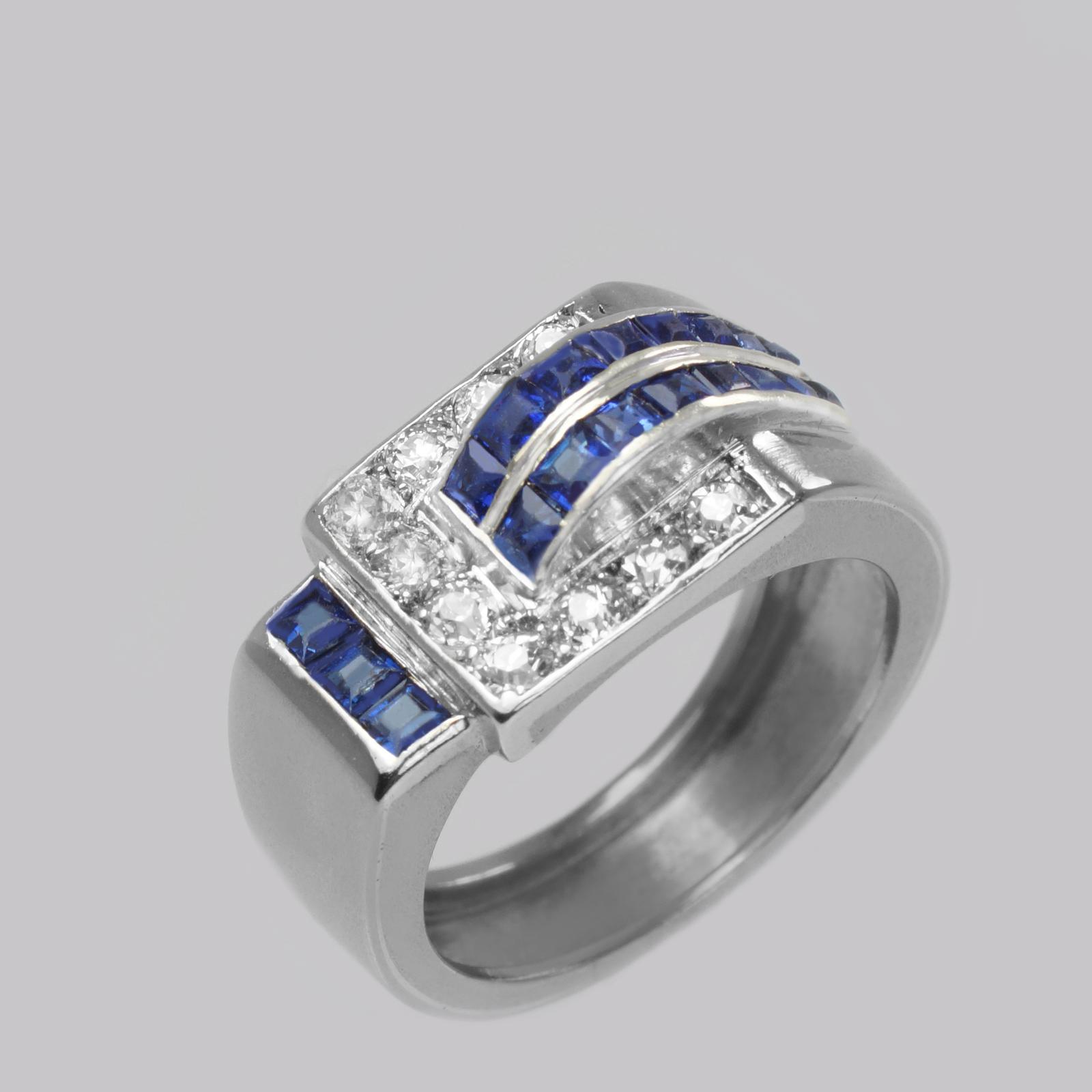 Diamond & Sapphire Art Deco Ring 18ct Gold 1930's Vintage Large Retro Dress Ring