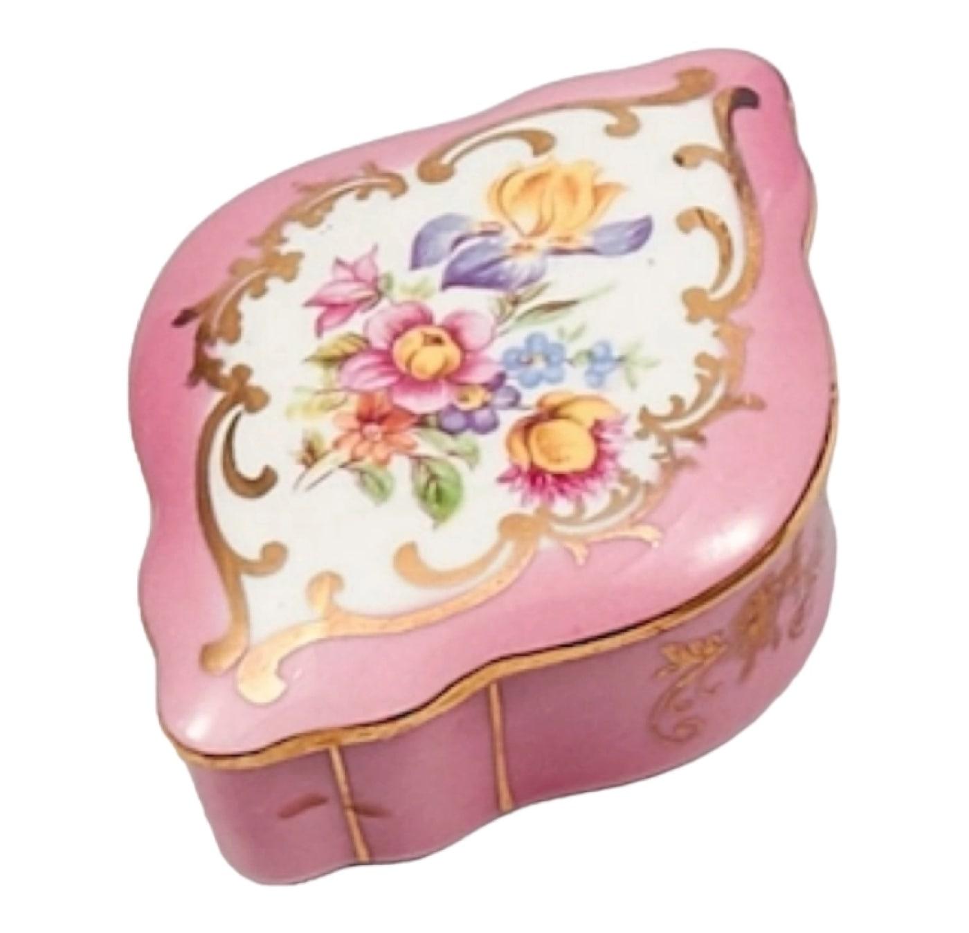 Diamond-shaped porcelain box with a flower bouquet on pink on the lid.