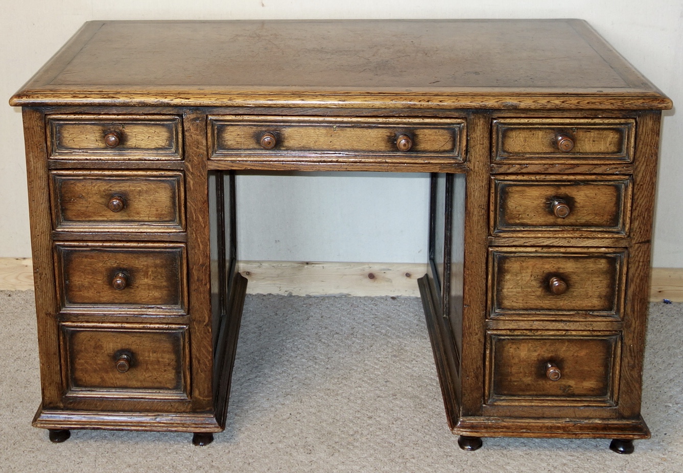 Distressed Oak 9 Drawer Leather Desk c.1930