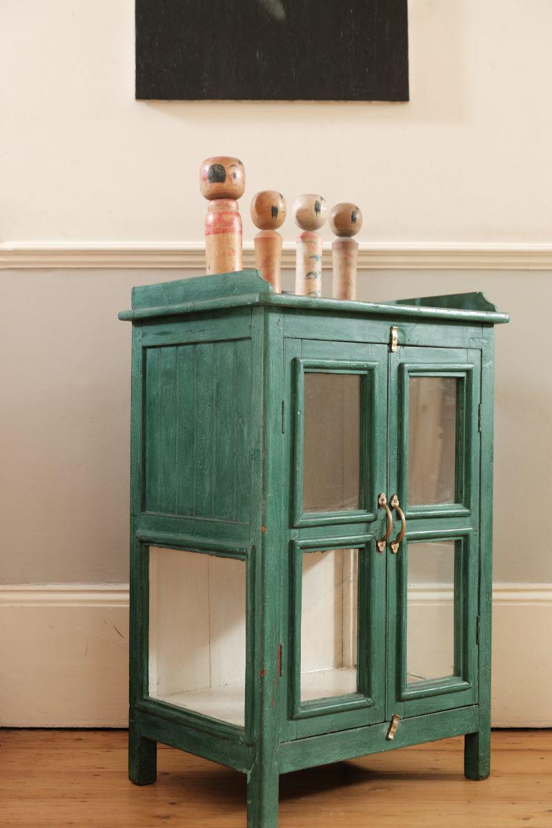 Distressed Painted Cabinet with Two Glazed Doors Bottom Glazed Side Panels