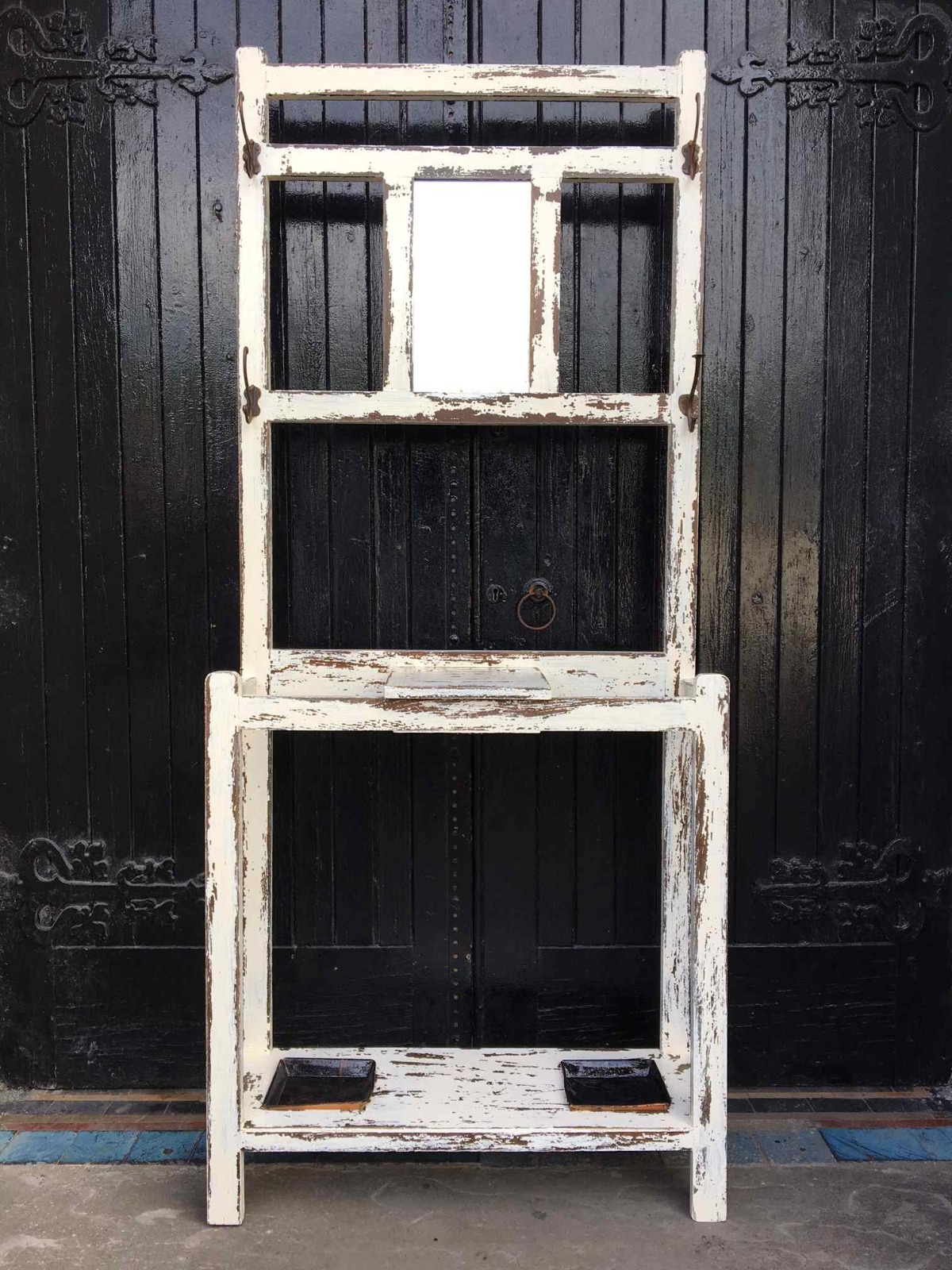 Distressed White Painted Oak Hat & Coat Hall Stand with Mirror C.1920