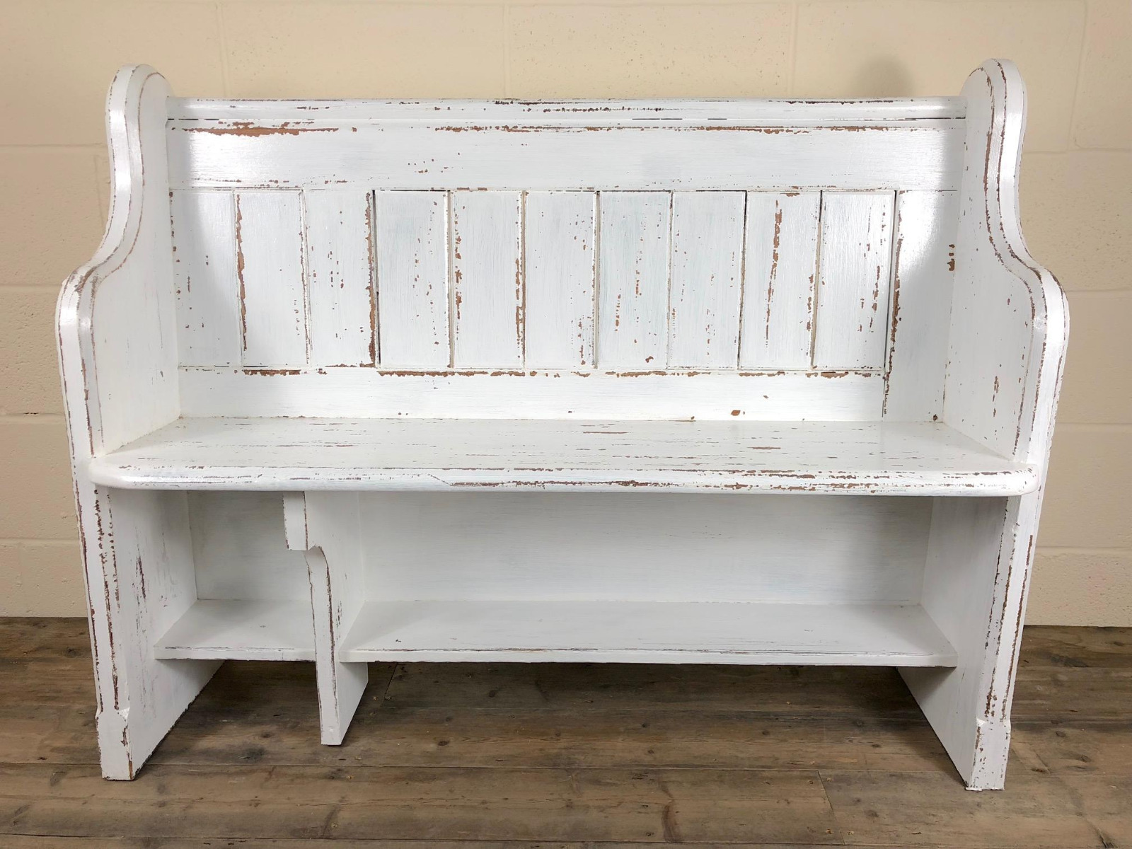 Distressed White Painted Pitch Pine Chapel Pew with Enamel Numbers (1 of 1)