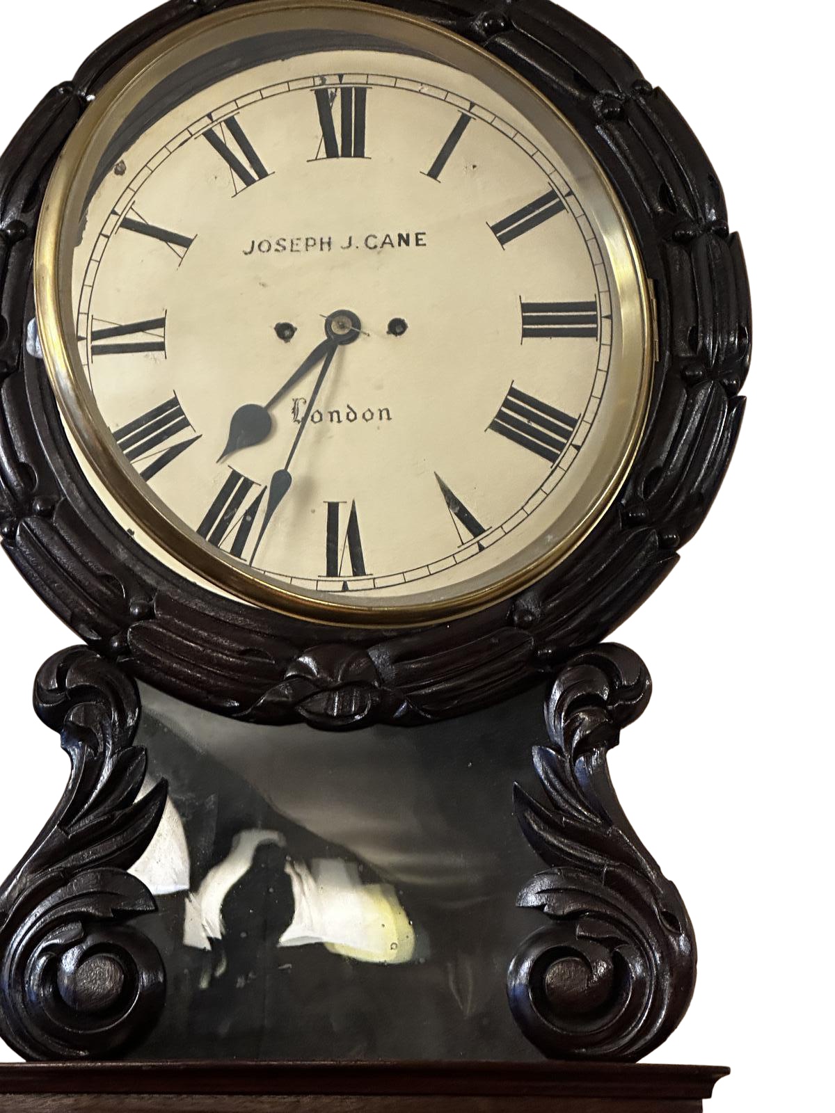 A fantastic quality rare Double Fusee carved English 12 inch drop dial wall dial clock by Joseph J Cane of London with cast brass bezel.