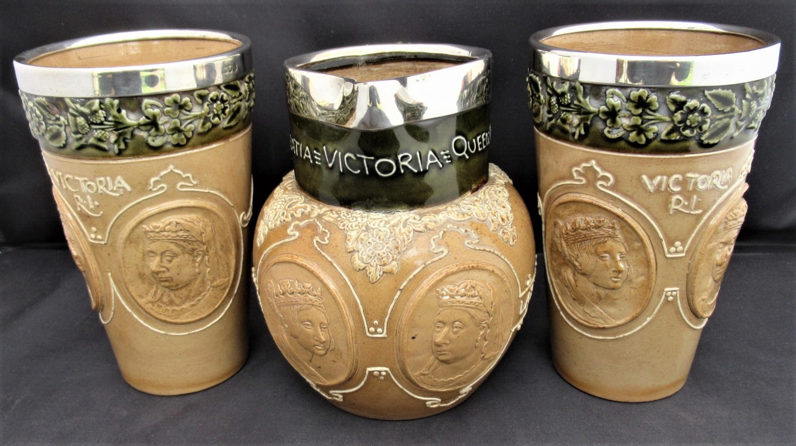 Doulton Lambeth Jug & 2 Beakers 1897 Queen Victoria Diamond Jubilee, Silver Rims