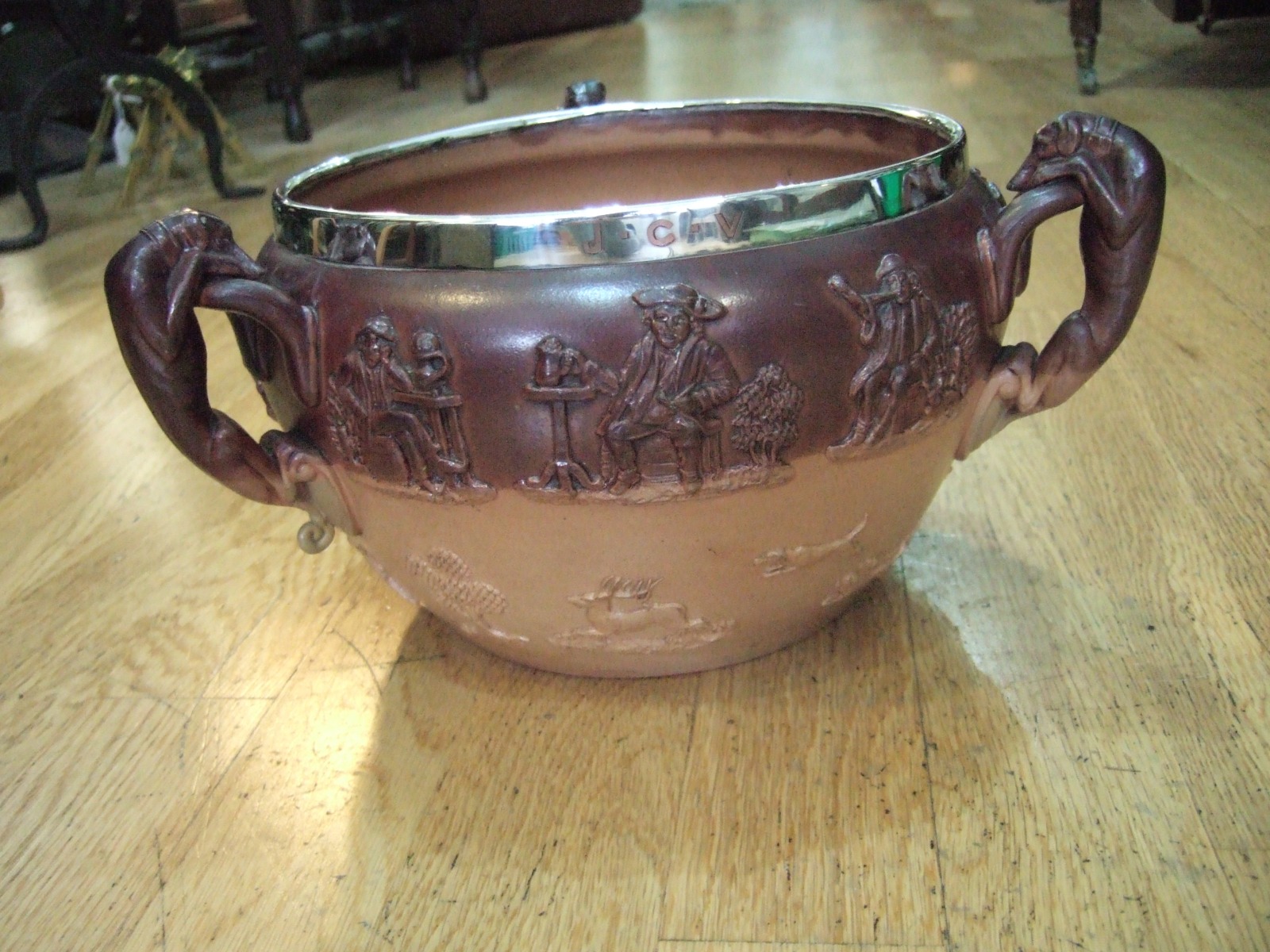 Doulton Lambeth Three Handled Jardiniere with Plated Rim 1880