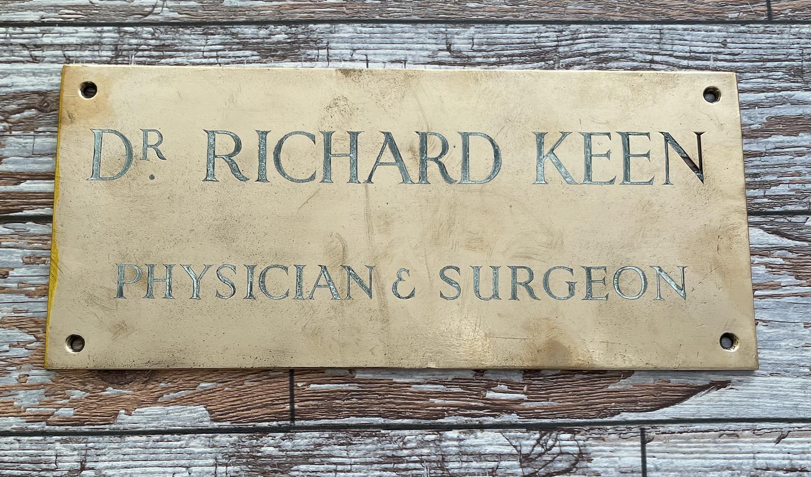 Offered for sale is this brass name plate for Dr Richard Keen, Physician and Surgeon.