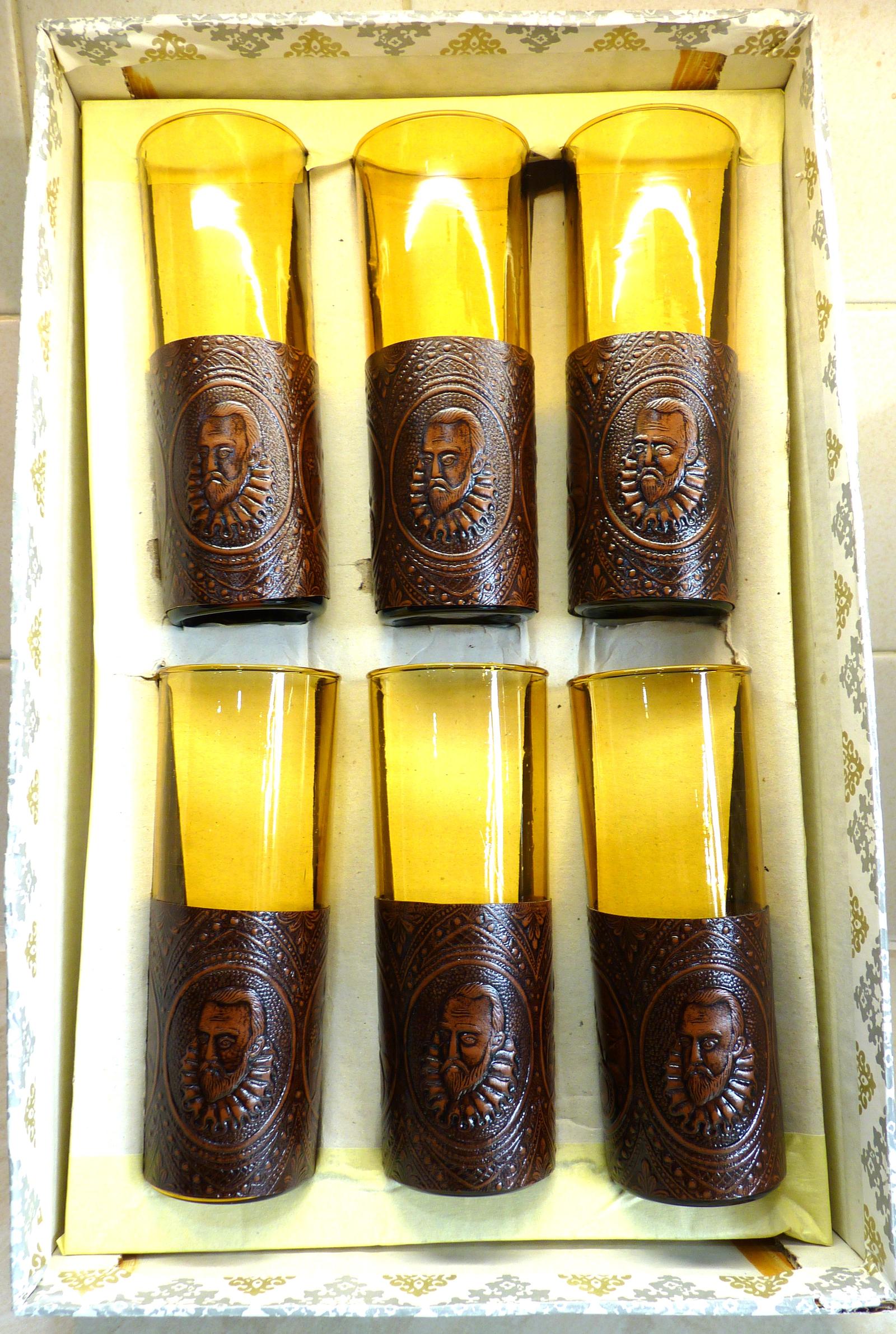 Drinking Glass Set: Rare Set of 6 x Handblown Drinking Glasses with Don Quixote Theme