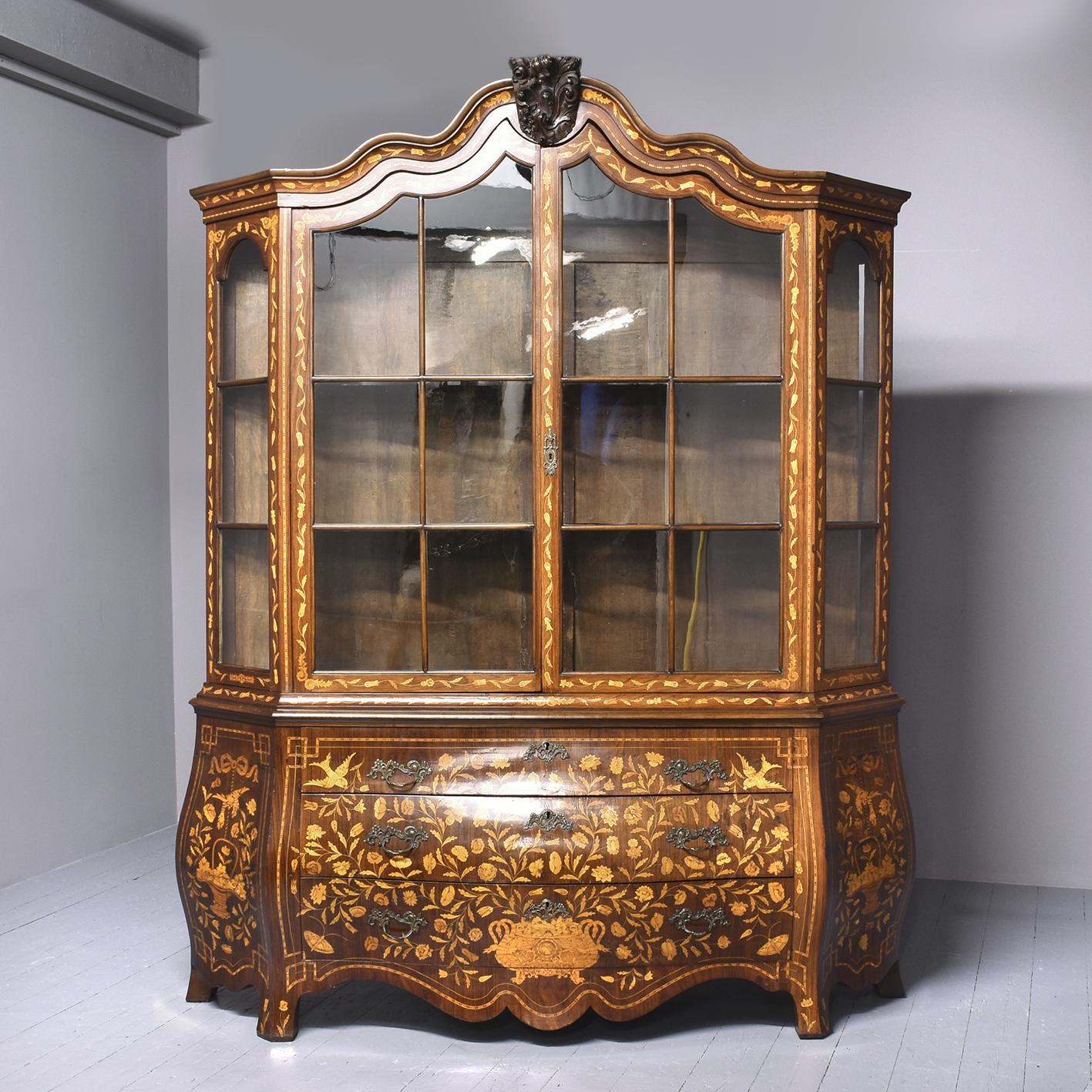 Dutch Marquetry Inlaid Bombe Front Display Cabinet