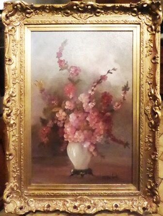 Dutch Still Life Oil Painting of Lilac Pink Wax Begonia Flowers in a Vase by Artist M.Van Lente