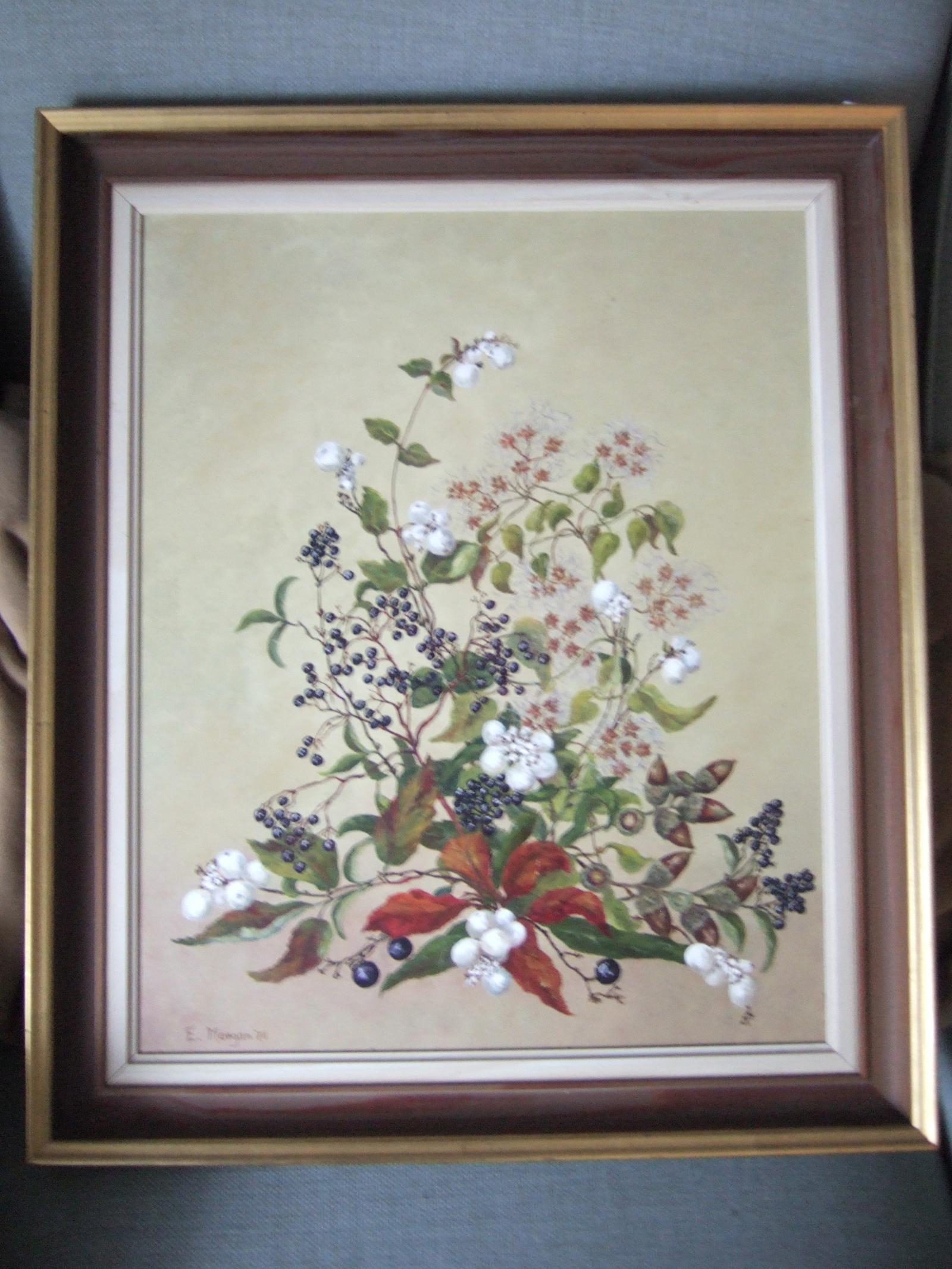 E Morgan:  oil on board.  Still life with autumnal fruiting plants (1 of 4)