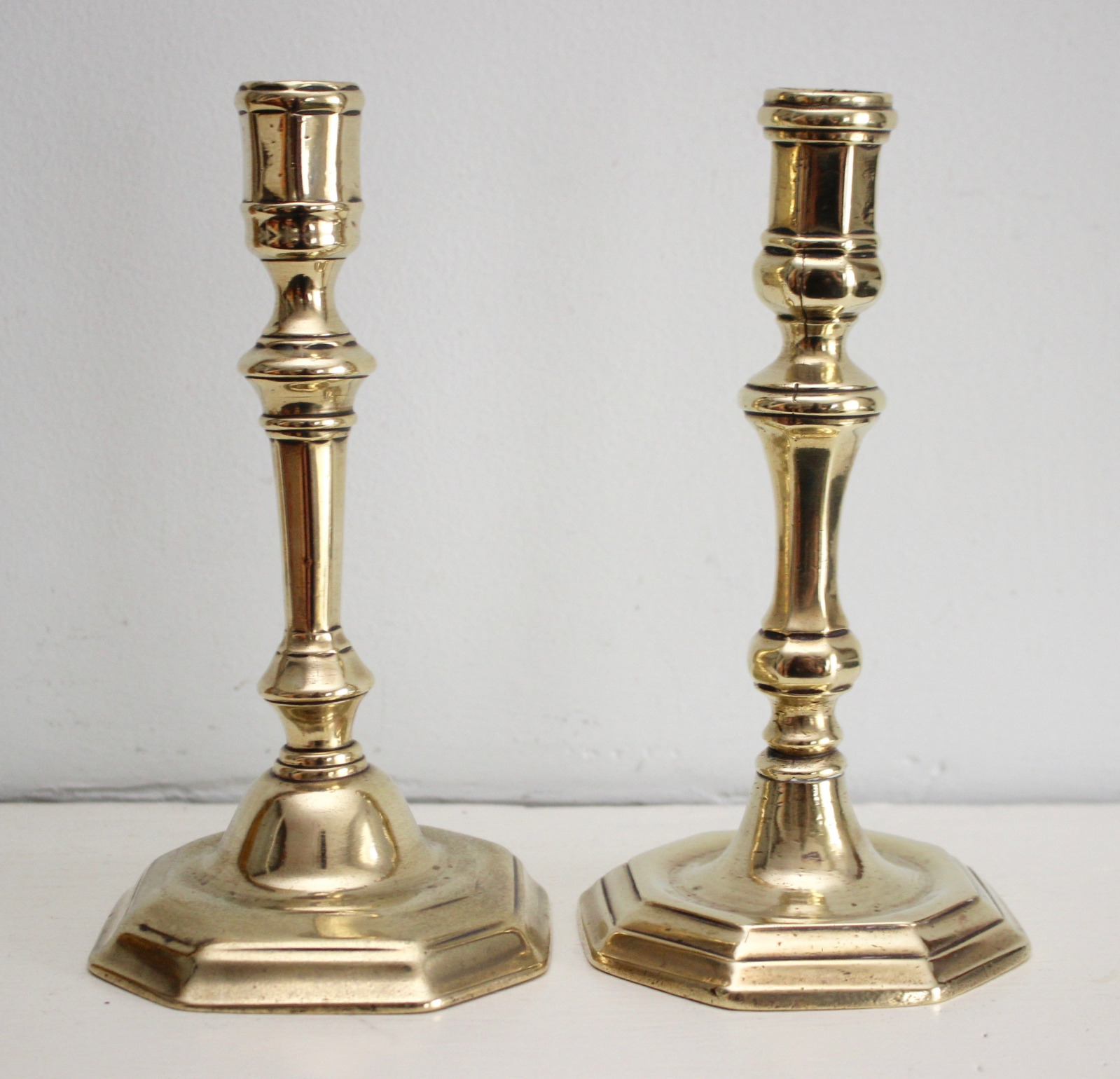 Early 18th Century English Candlesticks, Near Pair, Octagonal Bases, Side Seam