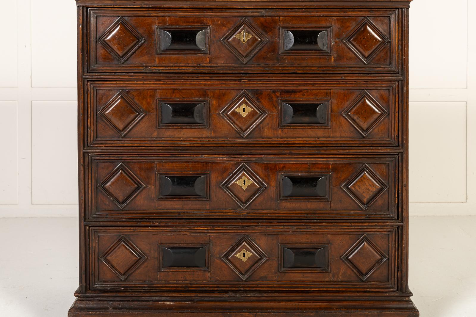 The chest with four equally sized drawers, all with raised diamond shaped and ebonised rectangular bosses. There is a key and the escutcheon plates to the central bosses are brass. Each drawer has a cockbeaded edge and other mouldings. The sides of the chest have straighter grained walnut but the top is veneered in burl walnut of lovely colour and patina.