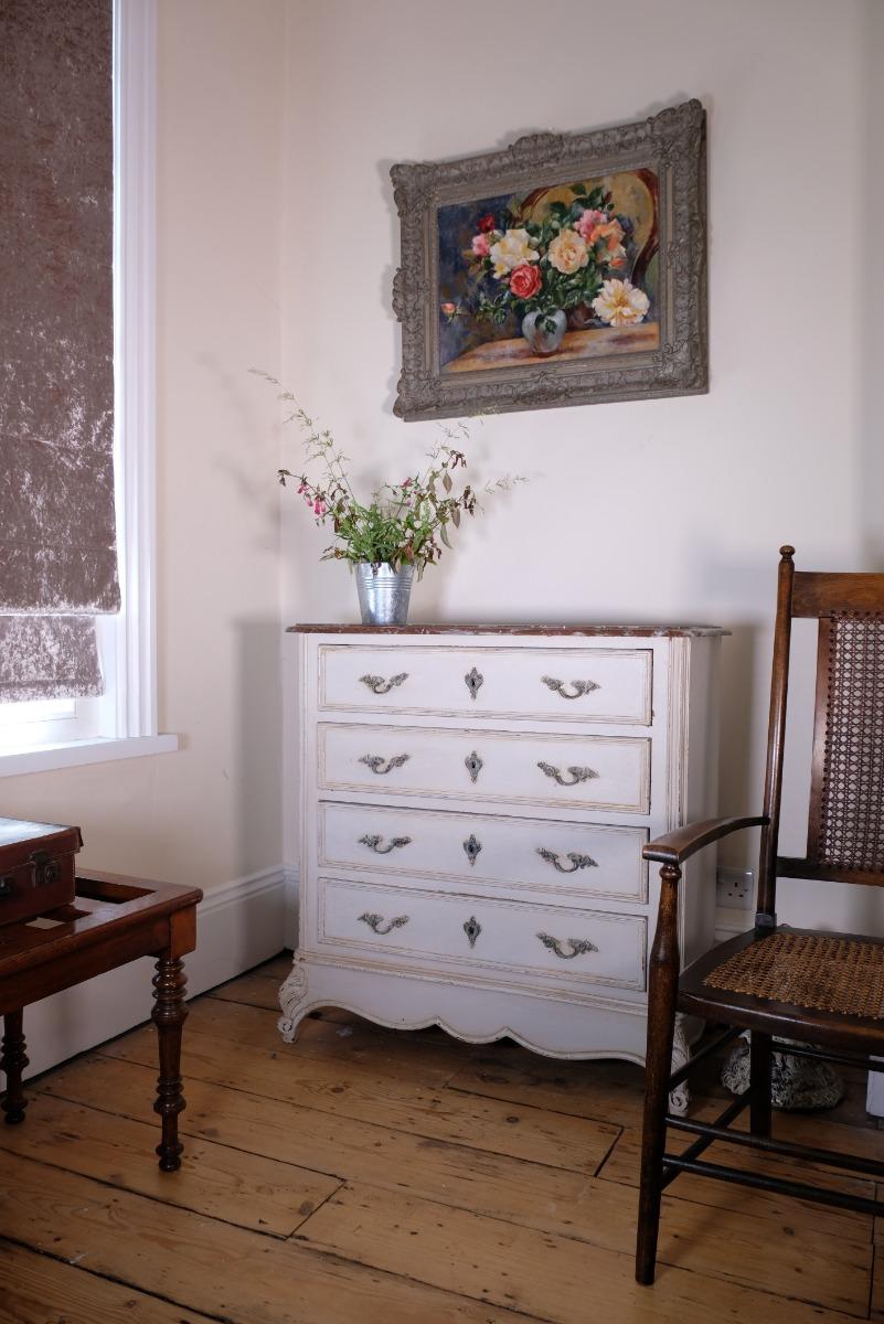 Early 1900's French Painted Four Drawer Chest With Marble Top