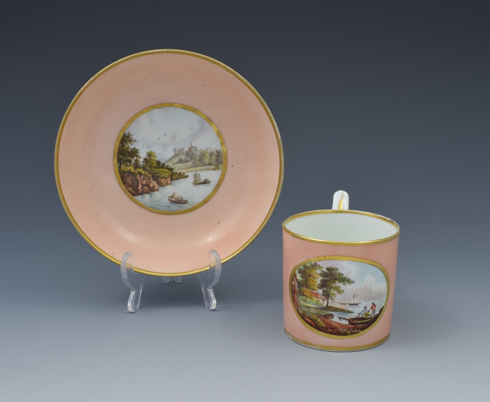 Early 19th Century Derby Salmon Coffee Can & Saucer Cow's Castle & Windsor
