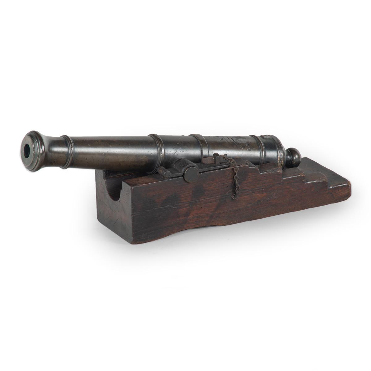 This fine cast bronze signal cannon is significant for a number of reasons. It retains its original stepped gun carriage and is signed by the maker ‘W Parker, Maker to His Majesty, Holborn, London’. This indicates that the piece was made during the George IV or William IV periods. Parker was active from his 233 High Holborn address between 1793 and 1841 and was appointed gunmaker to the Duke of Kent, Prince Edward and King William IV. None of his numerous adverts in the surviving newspapers from the earlier 19th century make mention of him receiving a royal warrant from Kings George III or IV but the fact that a trade card by Parker from the Sarah Sophia Banks collection survives in the British Museum complicates matters. Banks’ collection was acquired by the museum in 1818 and this card.