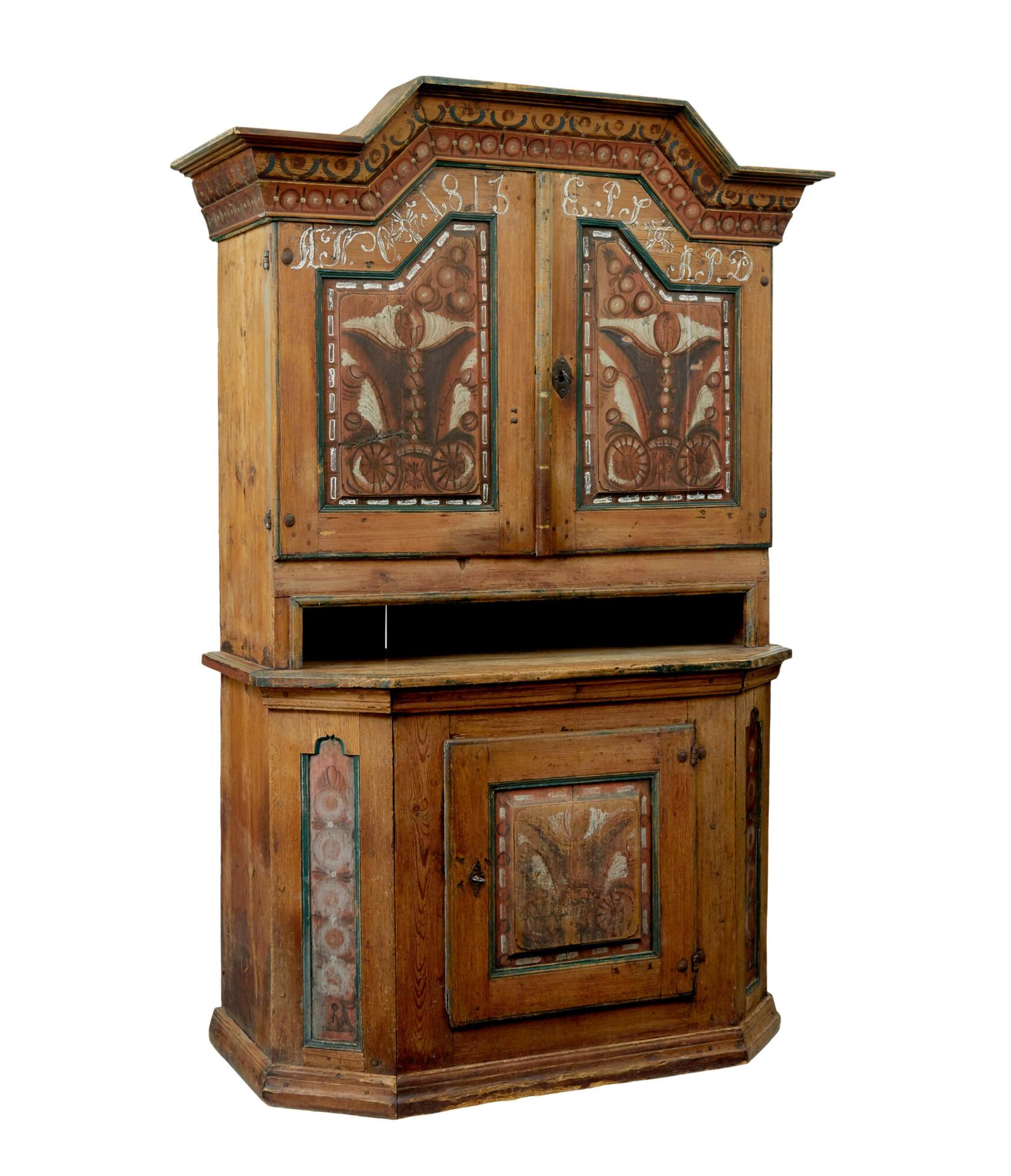 Early 19th century hand painted swedish folk art cupboard circa 1813. Fine example of swedish traditional furniture, comprising of 2 parts, the main body and a lift off cornice. We choose this piece on our travels as it's more substantial than the normal and has a open storage aperture half way up, which is not typical. profusely hand painted using a kurbit method of application. piece is initialed and dated 1813 just below the cornice. double door upper cupboard opens to reveal a interior of 2 fixed shelves and a further shallow shelf, partially concealed in the cornice. moving down to the shaped serving surface with original mouldings. single door cupboard below, containing 1 fixed shelf for plenty of storage. moulded edging at floor level to finish. Working locks and key. Expected surface marks and fading for a 200 old piece of furniture. evidence of woodworm damage that has long been treated and no longer active. strengthening on the inside of panel to lower cupboard. beautiful piece of rustic furniture, still ready for everyday use.