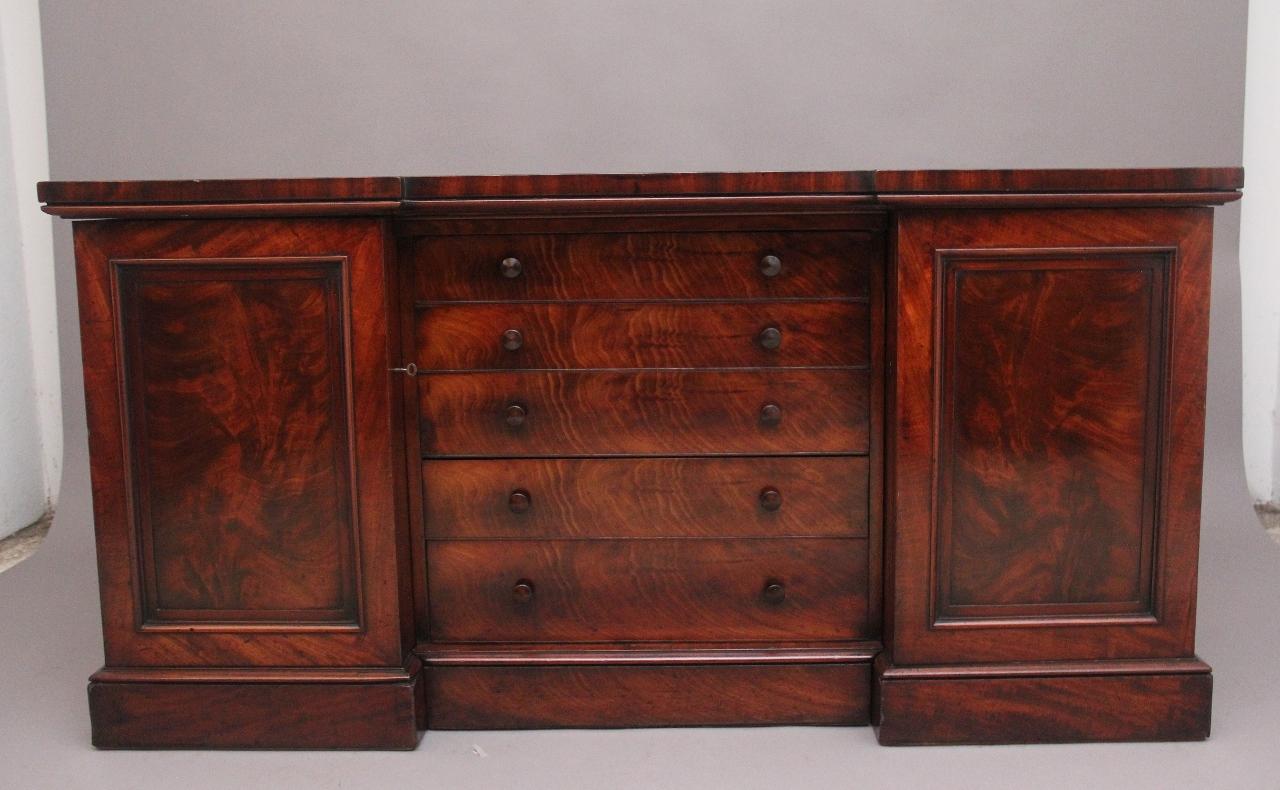 Early 19th Century flame mahogany sideboard / cabinet of exceptional quality, having a shaped and figured top above five graduated oak lined drawers with the original turned wooden knob handles, flanked either side with cupboards, the left cupboard having four pull out slides and the right cupboard having a cellarette drawer with compartment space above, both hinged doors having moulded panels and fabulous flame mahogany, as well as the central drawer fronts, supported on a plinth base. Circa 1830.