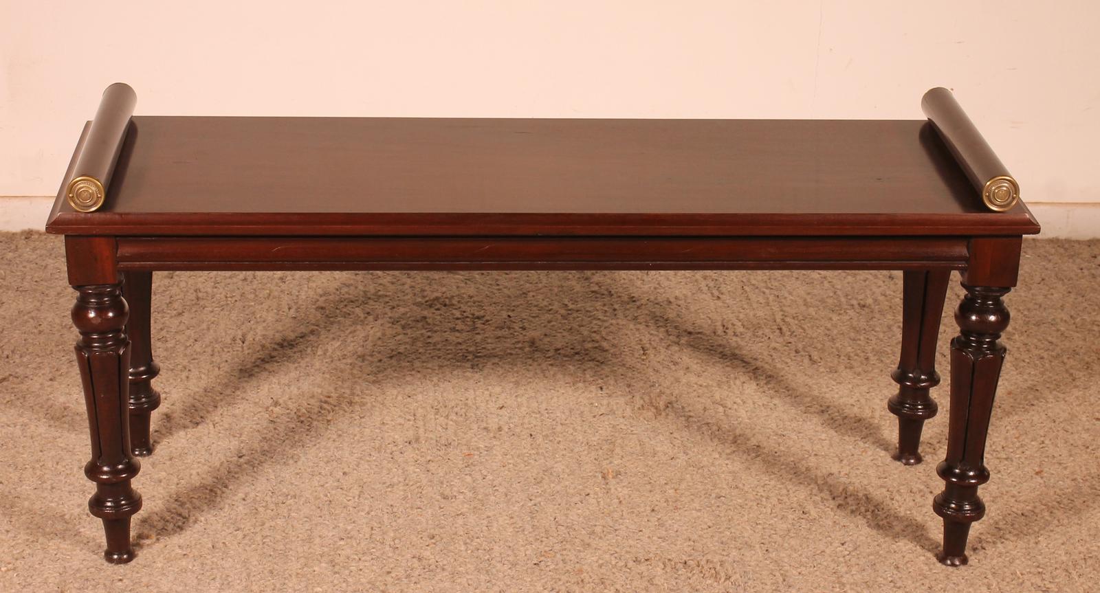 unusual and highly sought-after solid mahogany bench featuring a superb one-piece top with a beautiful flame and two brass-decorated Turned Rolls To Each End,