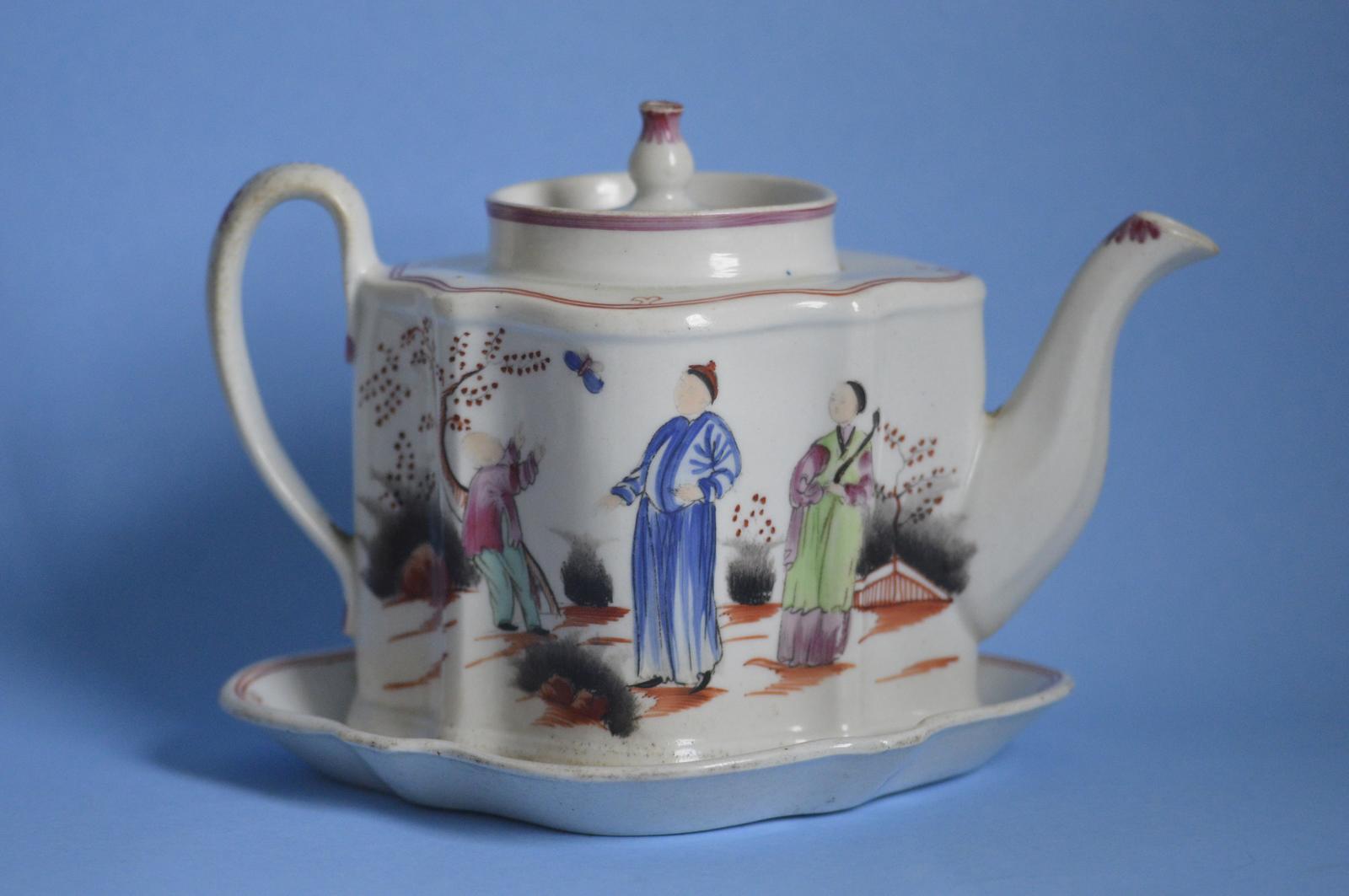 Early 19th Century New Hall Teapot + Stand -boy + Butterfly