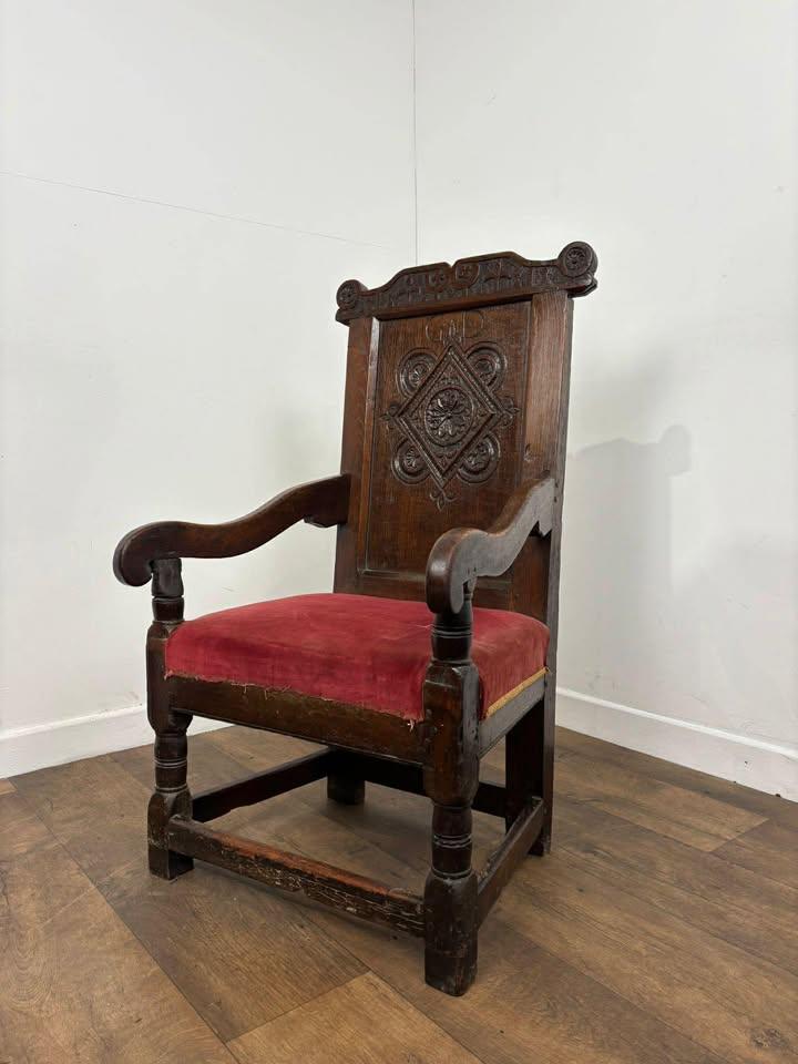Structurally the chair remains solid, with the expected signs of age and use throughout. There is evidence of historic woodworm, and some trim is missing to the front, but overall it presents as a strong, usable piece with great decorative appeal.