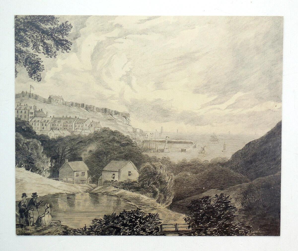 For sale is this well-executed pencil drawing of a coastal town probably somewhere in The United Kingdom. From the style of clothes the figures are wearing and the ships in the harbour, I would guess that this was drawn sometime around 1820 to 1830. The fort on top of the hill overlooking the town looks like it has a pallisade surrounding it so it is possible this was drawn during the time of the Napoleonic wars. The drawing measures about 9 x 11 inches and weighs 28 grams. It is drawn on a thin card which is magnolia or cream in colour. The drawing is in good condition with no tears or folds. A couple of minor scratches and some staining especially verso.