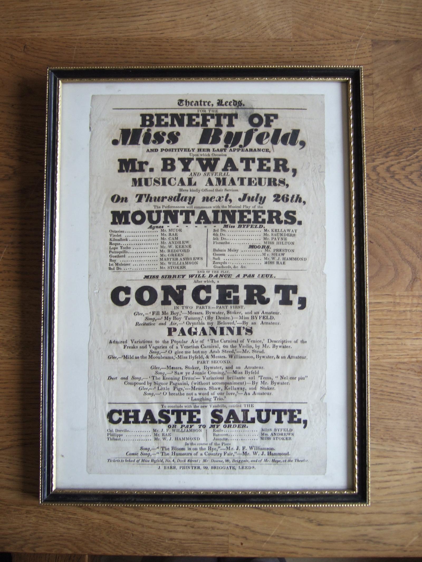 Early 19th Century Playbill from the Theatre, Leeds for a Benefit Performance for Miss Byfeld